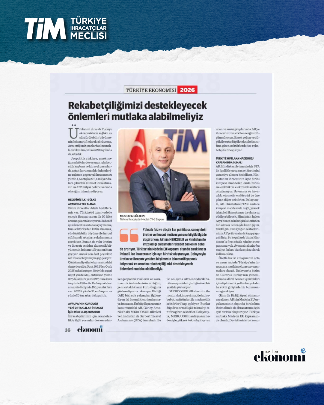 TİM Başkanı Mustafa Gültepe, ihracat gündemine ilişkin Nasıl Bir Ekonomi'ye değerlendirmelerde bulundu. Yüksek faiz ve düşük kur politikasının, sanayideki üretim ve ihracat motivasyonunu büyük ölçüde düşürdüğünü belirten Gültepe, AB'nin Mercosur ve Hindistan ile imzaladığı anlaşmaların rekabet baskısını daha da artırdığına dikkat çekti. Gültepe, “Üretim ve ihracatı yeniden büyümenin lokomotifi yapmak istiyorsak en azından rekabetçiliğimizi destekleyecek önlemleri mutlaka alabilmeliyiz.” dedi.