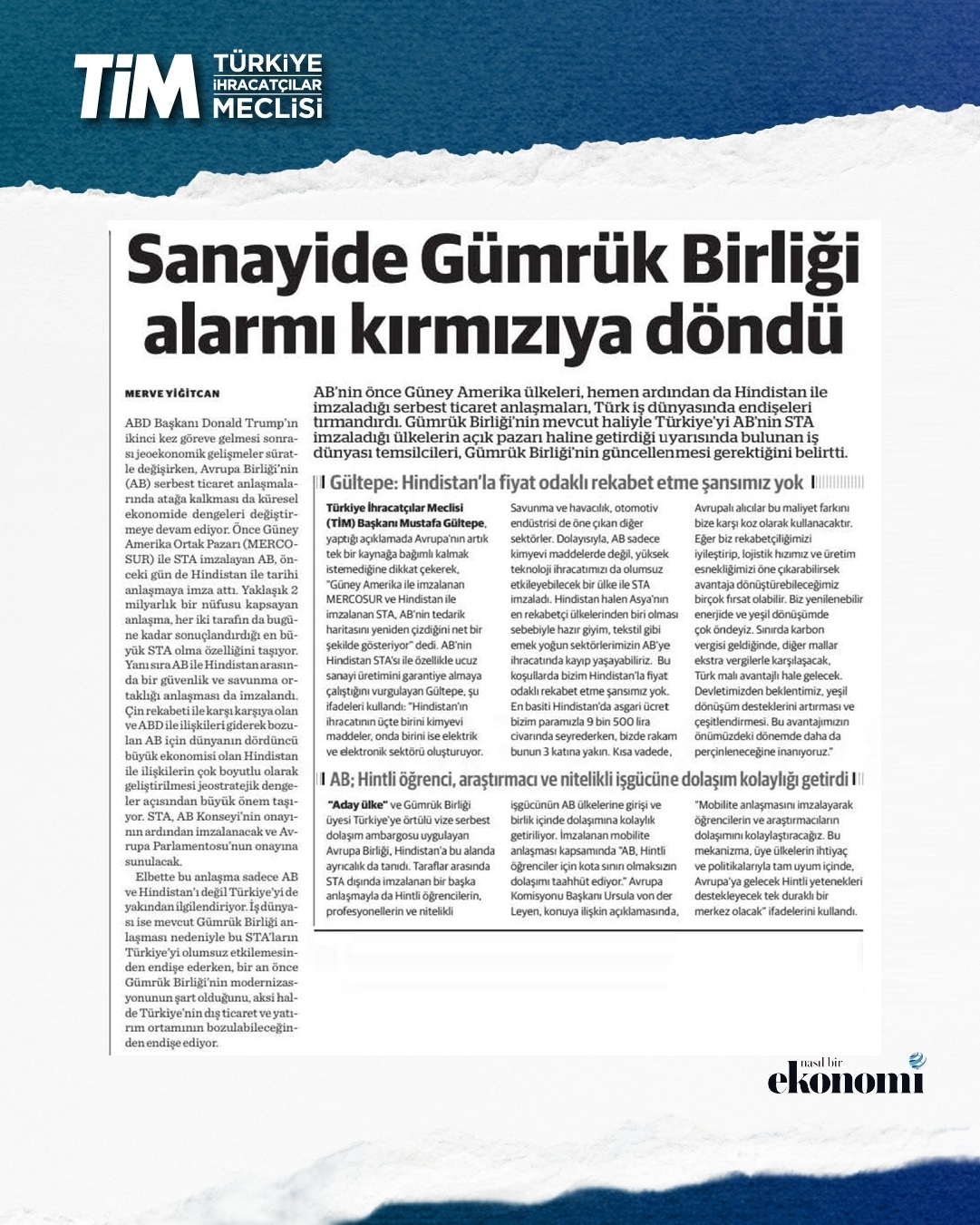 TİM Başkanı Mustafa Gültepe, AB ile Hindistan arasında imzalanan Serbest Ticaret Anlaşmasına ilişkin değerlendirmelerde bulundu. Avrupa'nın artık tek bir kaynağa bağımlı kalmak istemediğine dikkat çeken Gültepe, AB'nin tedarik haritasını yeniden çizdiğini ifade etti. Gültepe, “Hindistan halen Asya'nın en rekabetçi ülkelerinden biri. Emek yoğun sektörlerimizin AB'ye ihracatında kayıp yaşayabiliriz. Bu koşullarda Hindistan ile fiyat odaklı rekabet etme şansımız yok.” dedi.