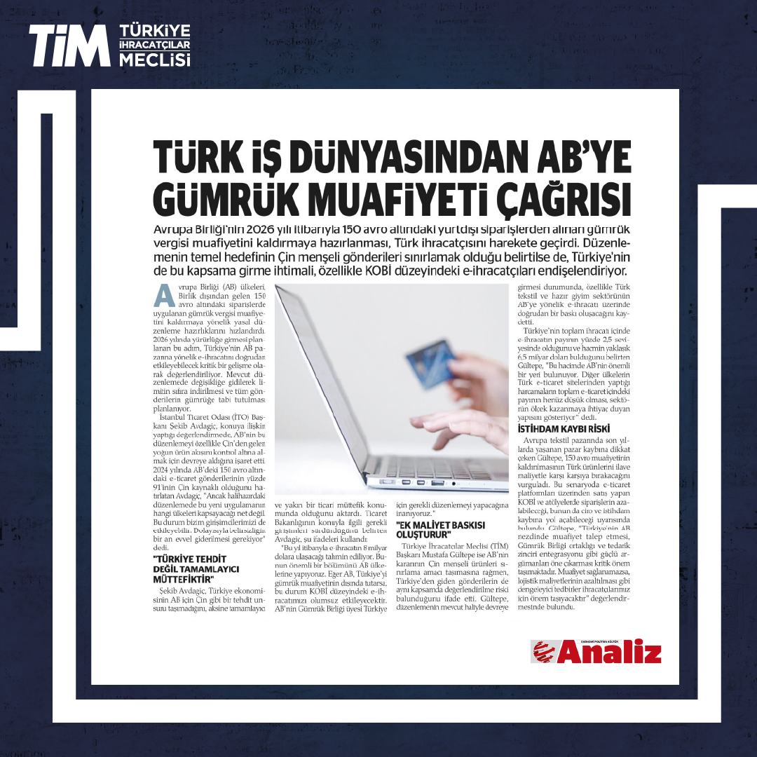 Avrupa Birliği (AB) ülkeleri, 150 euro altındaki yurtdışı siparişlerden alınmayan gümrük vergisi limitini, 2026 yılı itibarıyla kaldırmaya hazırlanıyor. Düzenlemenin özellikle Çin menşeli gönderileri sınırlama amacı taşıdığı belirtilse de mevcut haliyle Türkiye'den yapılan küçük ölçekli e-ticaret gönderilerinin de bu kapsama girmesi bekleniyor. TİM Başkanı Mustafa Gültepe, konuya ilişkin yaptığı değerlendirmede, AB'nin muafiyeti kaldırma kararının Türk tekstil ve hazır giyim sektörünü baskı altına alabileceğini belirtti. Gültepe, “Bu nedenle Türkiye'nin AB nezdinde muafiyet talep etmesi, Gümrük Birliği ortaklığı, tedarik zinciri entegrasyonu ve AB'ye uyum kapasitesi gibi güçlü argümanları öne çıkarması kritik önem taşımaktadır.” dedi.