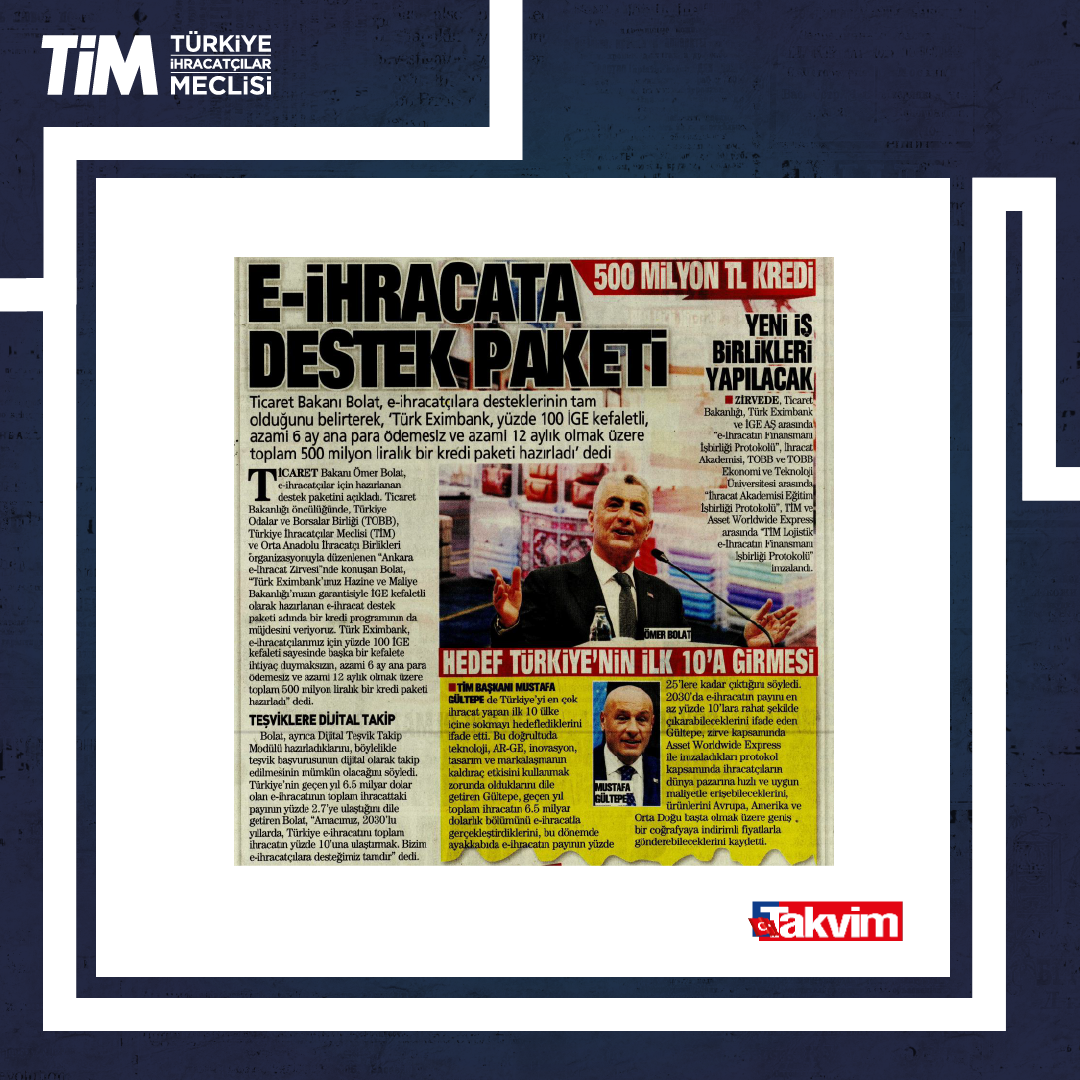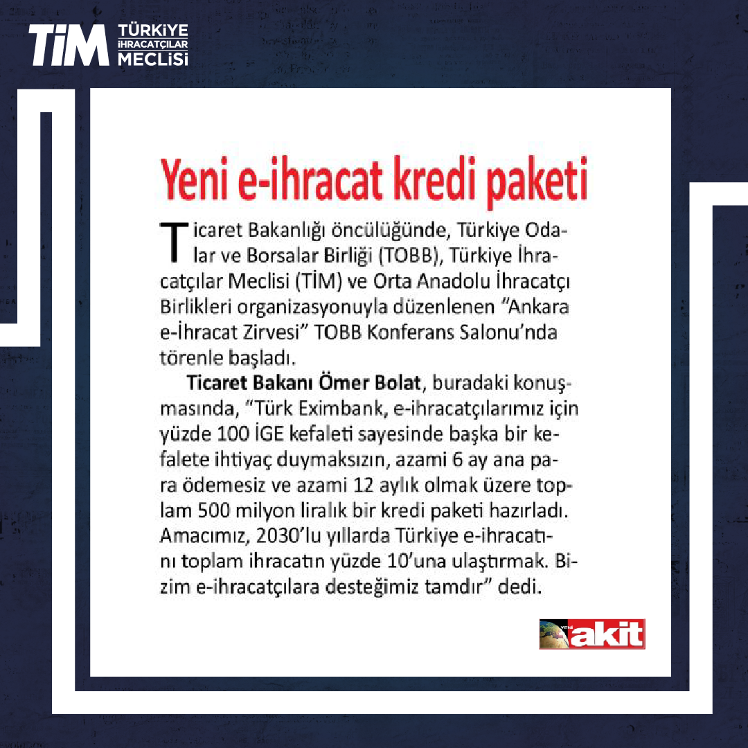 Ankara E-İhracat Zirvesi - 7 Kasım 2025 Ekim 2025 Dış Ticaret Verileri Basın Açıklaması - 5 Kasım 2025 Türkiye Innovation Week 2025 - 2 - 12 Ekim 2025 Türkiye Innovation Week 2025 - 10 Ekim 2025 Eylül 2025 Dış Ticaret Verileri Basın Açıklaması - 3 Ekim 2025 TIW25 Basın Lansmanı - 1 Ekim 2025 İstanbul Mobilya Tasarım Fuarı (FDI) - 26 Eylül 2025 17. Uluslararası Ekoteks Tekstil Sempozyumu - 24 Eylül 2025 Türk Ticaret Bankası Denizli Şube Açılışı - 12 Eylül 2025 Ağustos 2025 Dış Ticaret Verileri Basın Açıklaması - 4 Eylül 2025 TÜİK Büyüme Rakamları Değerlendirmesi - 2 Eylül 2025 Türkiye-Suriye Ticaret İlişkilerine Dair Değerlendirme - 29 Ağustos 2025 İstanbul Kalkınma Ajansı 2025 Yılı Mali Destek Programları (MDP) - 28 Ağustos 2025 İhracat Pazar Monitörü Temmuz Ayı Sonuçları - 26 Ağustos 2025 IFCO İstanbul Hazır Giyim ve Moda Fuarı - 21 Ağustos 2025 Türkiye Innovation Week 2025 - 13 Ağustos 2025 Türkiye-ABD Ticari İlişkilerine Yönelik Değerlendirme - 8 Ağustos 2025 Temmuz 2025 Dış Ticaret Rakamları Basın Açıklaması - 3 Ağustos 2025 İhracat 2025 Dosyası Değerlendirmesi - 31 Temmuz 2025 İhracat Pazar Monitörü - 29 Temmuz 2025