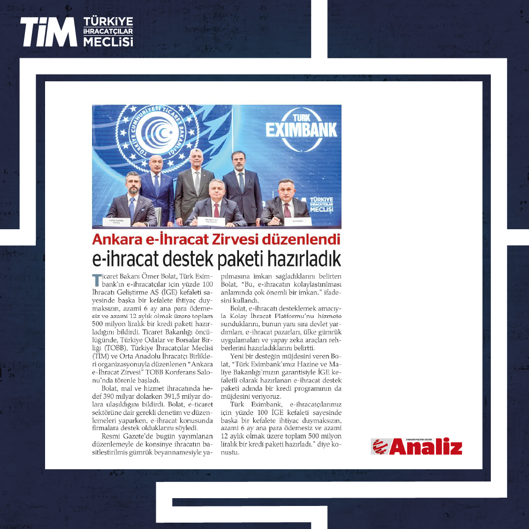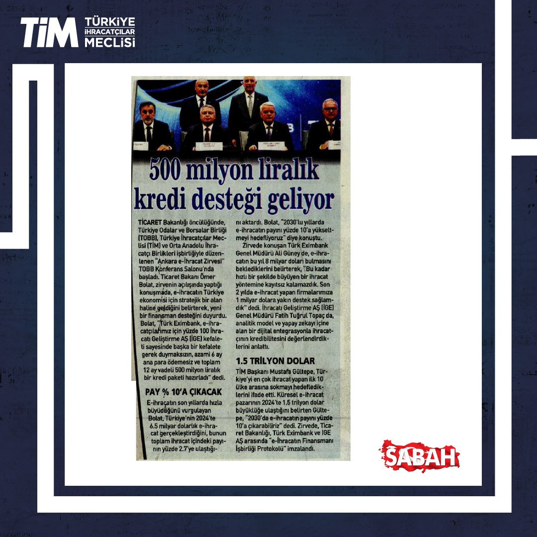 Ticaret Bakanlığı öncülüğünde, TOBB, TİM ve OAİB iş birliğiyle düzenlenen “Ankara e-İhracat Zirvesi” başladı. TİM Başkanı Mustafa Gültepe, zirvede yaptığı konuşmada Türkiye'yi en çok ihracat yapan ilk 10 ülke arasına çıkarmayı hedeflediklerini ifade etti. Küresel e-ihracat pazarının 2024'te 1.5 trilyon dolar büyüklüğe ulaştığını belirten Gültepe, “2030'da e ihracatın payını yüzde 10'a çıkarabiliriz” dedi. Zirvede TİM ile Asset Worldwide Express arasında iş birliği mutabakatı imzalandı. Mutabakat kapsamında, TİM üyeleri, AwwEx dijital platformu üzerinden yapacakları e-ihracat gönderilerinde yüzde 15 indirim avantajı elde edecek.