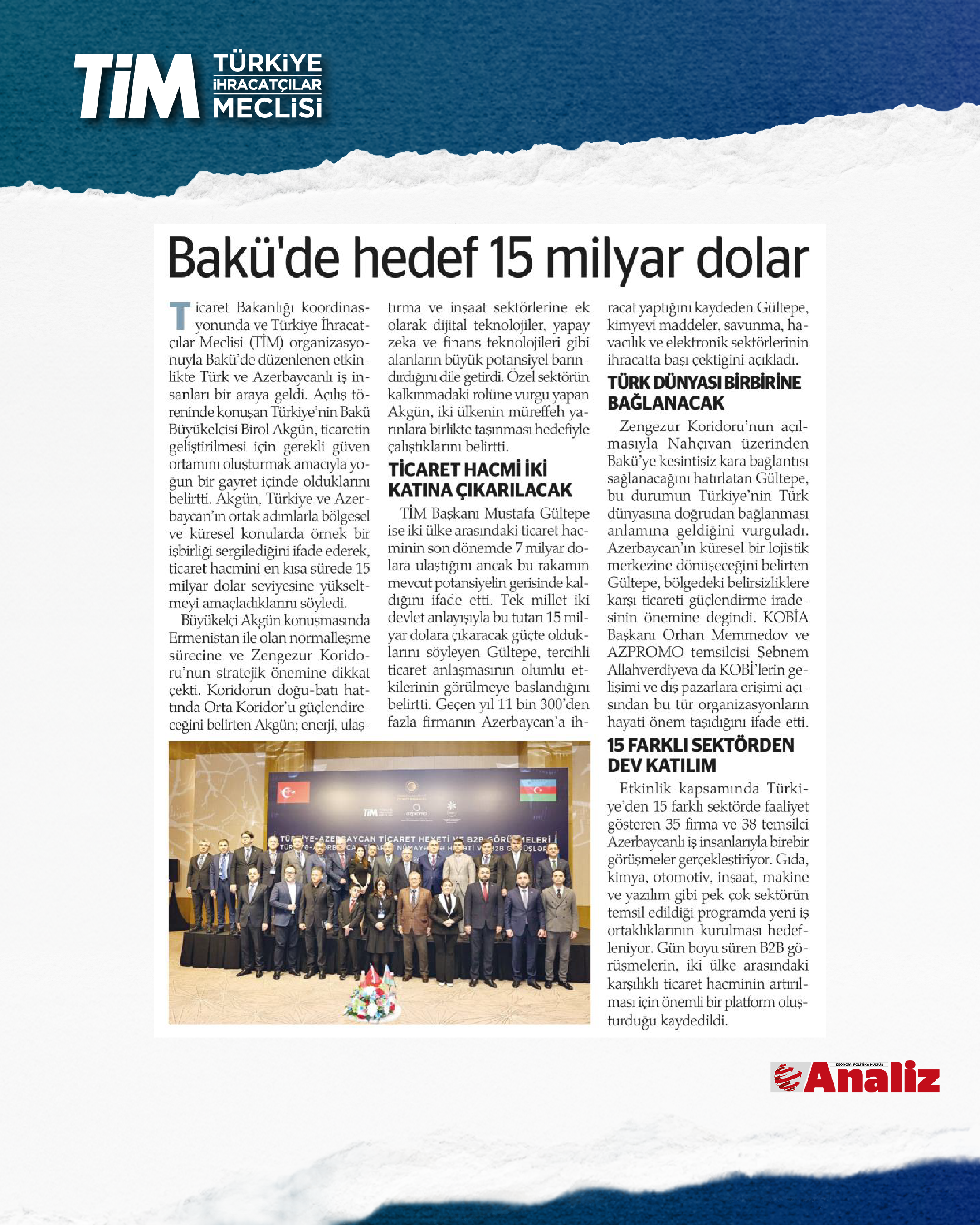 Türkiye İhracatçılar Meclisi (TİM), Azerbaycan İhracat ve Yatırımların Teşviki Ajansı (AZPROMO) ve Azerbaycan Küçük ve Orta Ölçekli İşletmeleri Geliştirme Ajansı (KOBİA) iş birliğinde, Azerbaycan'ın başkenti Bakü'de, "Türkiye–Azerbaycan Ticaret Heyeti ve B2B Görüşmeleri" gerçekleştiriliyor. Programın açılışında konuşan TİM Başkanı Mustafa Gültepe, iki ülke arasındaki ticaret hacminin arzu edilen seviyenin gerisinde olduğunu belirtti. Gültepe, “Son dönemde ticaret hacmimiz yaklaşık 7 milyar dolara ulaştı. Tek millet, iki devlet olarak biz orta vadede bu tutarı 15 milyar dolara çıkaracak potansiyelin olduğuna inanıyoruz.” dedi.