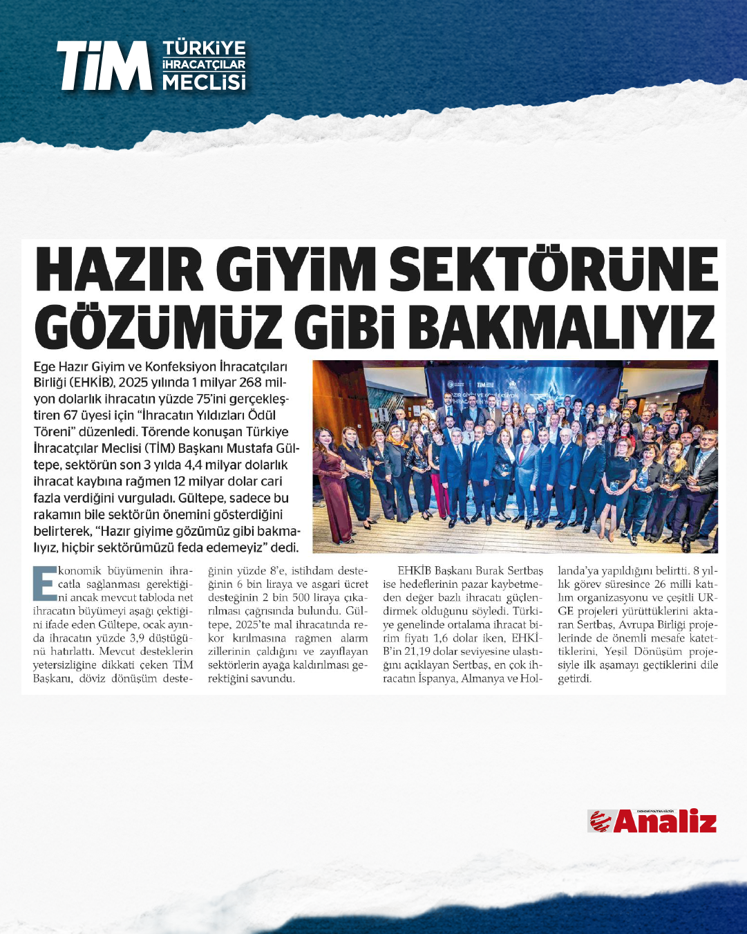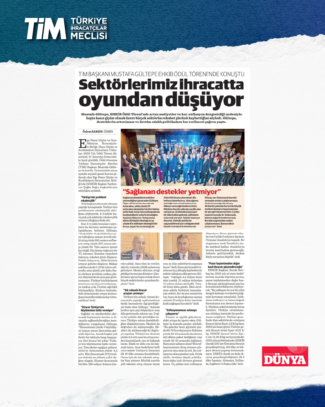 Ege Hazır Giyim ve Konfeksiyon İhracatçıları Birliği, Hazır Giyim ve Konfeksiyon İhracatının Yıldızları 2025 Yılı Ödül Töreni düzenledi. 67 ihracatçı firma ödüle layık görüldü. Ödül töreninde konuşan TİM Başkanı Mustafa Gültepe, artan maliyetler ve kur-enflasyon dengesizliği nedeniyle başta hazır giyim olmak üzere birçok sektörün rekabet gücünü kaybettiğini söyledi. Gültepe, “Türkiye'nin büyümesi güzel ama net ihracatın büyümeye katkısı yok. Üretim ağırlıklı büyümeliyiz. Böylece önümüzdeki dönemlerde ortaya koyacağımız hedefleri daha kolay tutturabiliriz.” dedi.