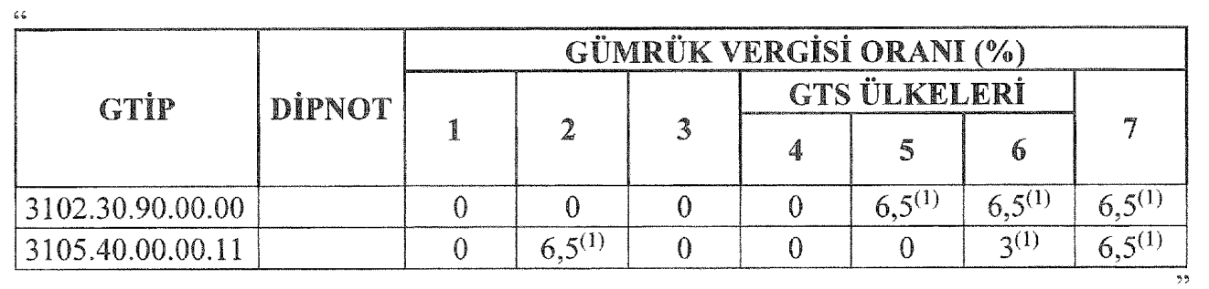 Karara göre 3102.30.90.00.00 G.T.İ.P numaralı amonyum nitrat için 1, 2, 3 ve 4 numaralı sütunlardaki gümrük vergisi oranı yüzde 0 olarak korunurken, 5, 6 ve 7 numaralı sütunlarda oran yüzde 6,5 olarak belirlendi.
