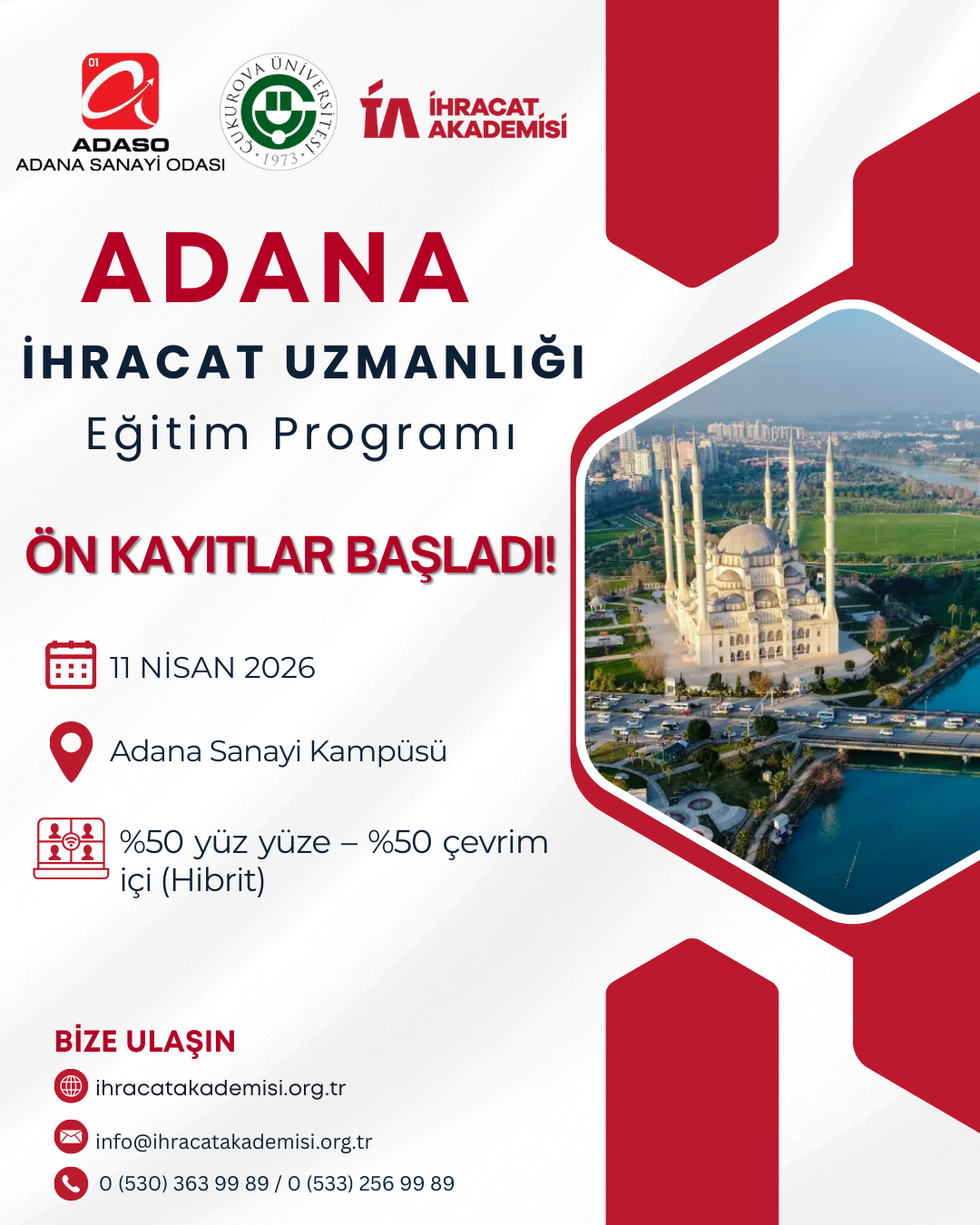 T.C. Ticaret Bakanlığınca, Yükseköğretim Kurulu iş birliği ile hayata geçirilen İhracat Akademisi kapsamında, 17 Aralık 2025 tarihinde Bakan Yardımcımız Sayın Özgür Volkan AĞAR himayelerinde gerçekleştirilen bir törenle, Adana Sanayi Odası ve Çukurova Üniversitesi ile İhracat Akademisi arasında eğitim iş birliği protokolü imzalanmıştır. Bu minvalde, Ek-1'de yer alan program akışı çerçevesinde 11 Nisan 2026 – 18 Mayıs 2026 tarihleri arasında Adana Sanayi Kampüsünde Adana İhracat Uzmanlığı Eğitim Programının gerçekleştirilmesi planlanmaktadır.