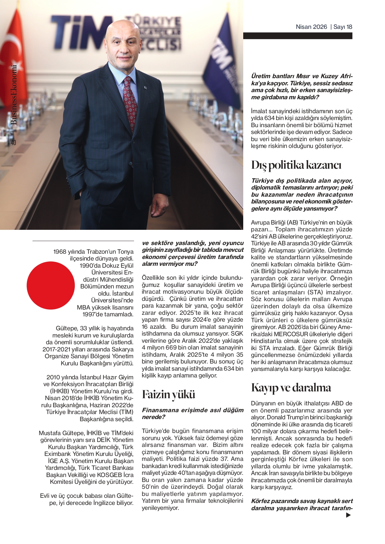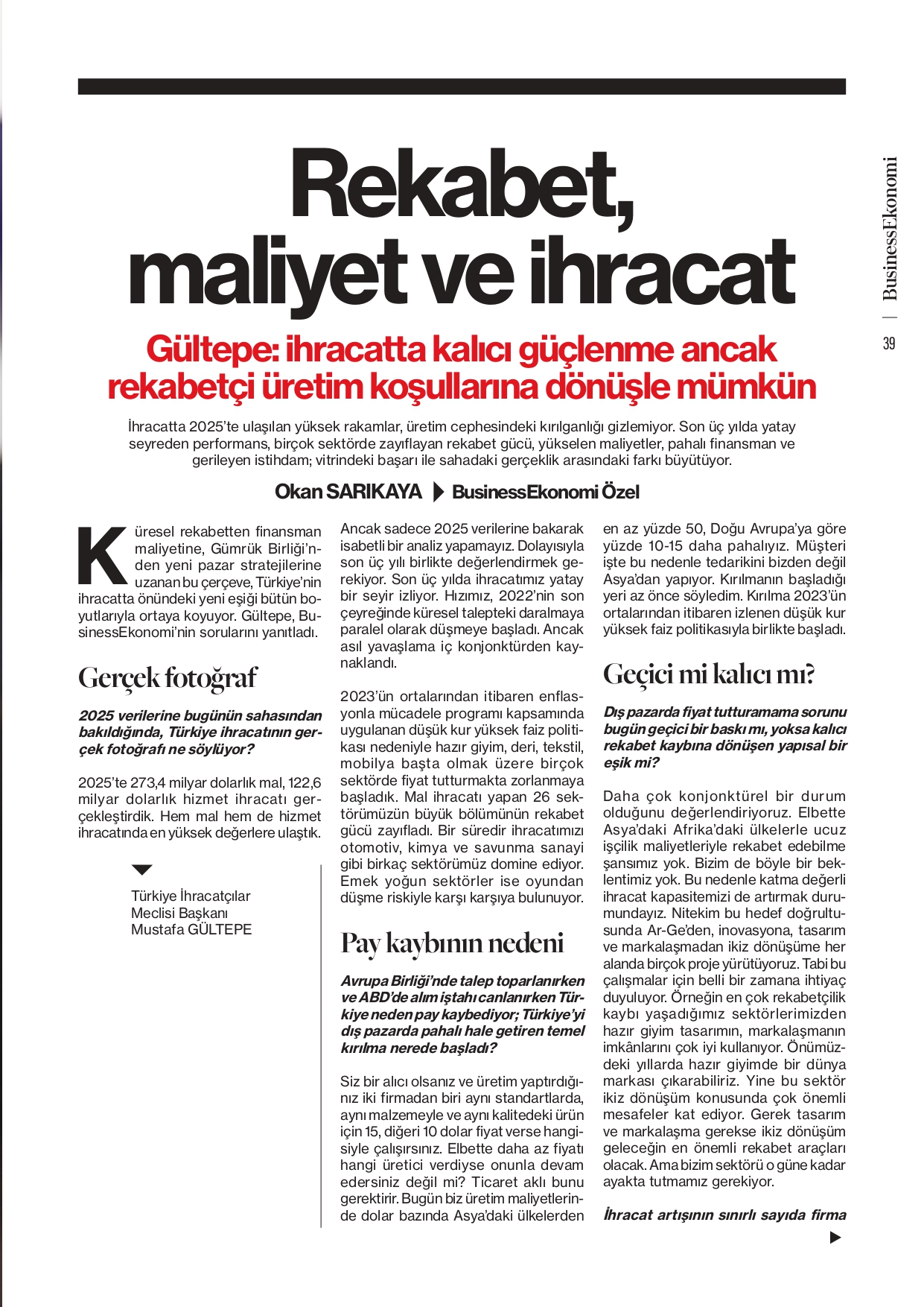 TİM Başkanı Mustafa Gültepe, Business Ekonomi dergisinin son sayısında ihracata ilişkin soruları yanıtladı. Röportajda, son üç yılda ihracatın yatay bir seyir izlediğini belirten Gültepe, emek yoğun sektörlerin oyundan düşme riskiyle karşı karşıya olduğunu ifade etti. Öncelikle rekabetçi üretim yapılabilecek koşullara dönülmesi gerektiğini vurgulayan Gültepe, “Bu koşulların sağlanması için devletten beklentilerimizi her platformda dile getiriyoruz. İhracatta kalıcı güçlenme ancak rekabetçi üretim koşullarına dönüşle mümkün.” dedi.