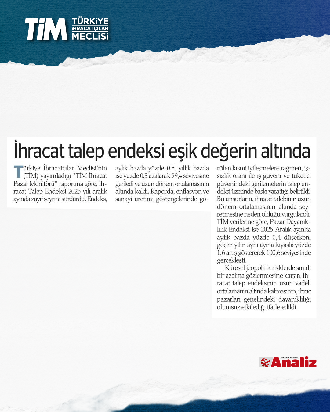 Türkiye İhracatçılar Meclisi “İhracat Pazar Monitörü” raporunu yayımladı. Yayımlanan rapora göre İhracat Talep Endeksi, aralık ayında aylık bazda yüzde 0,5, yıllık bazda ise yüzde 0,3 azalarak 99,4 seviyesine geriledi ve uzun dönem ortalamasının altında kaldı.