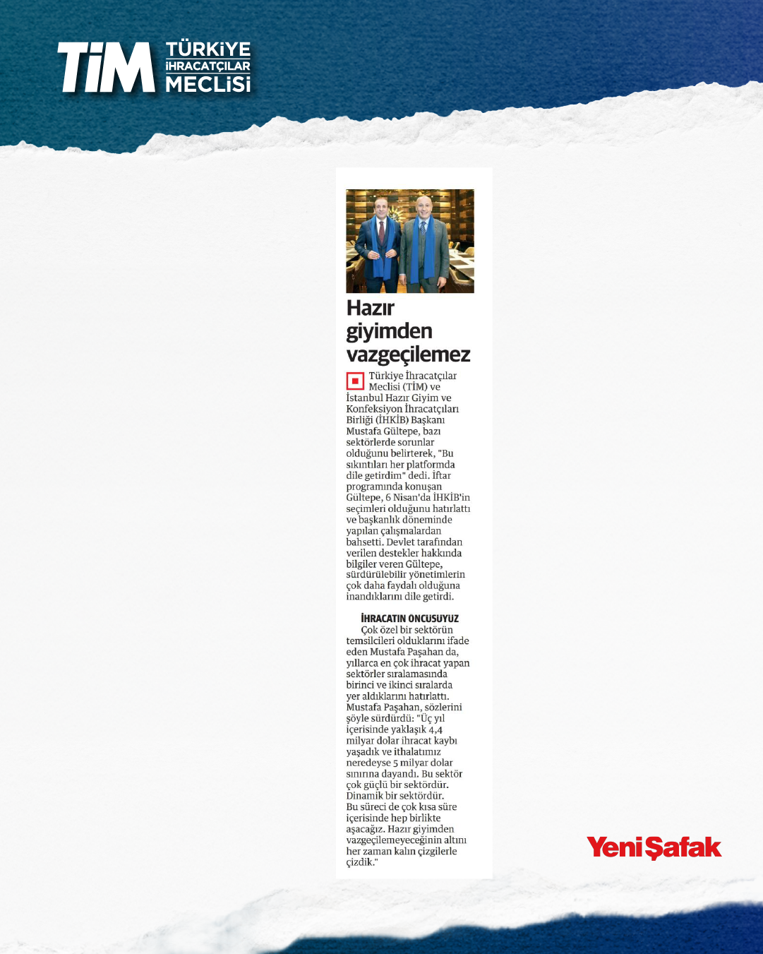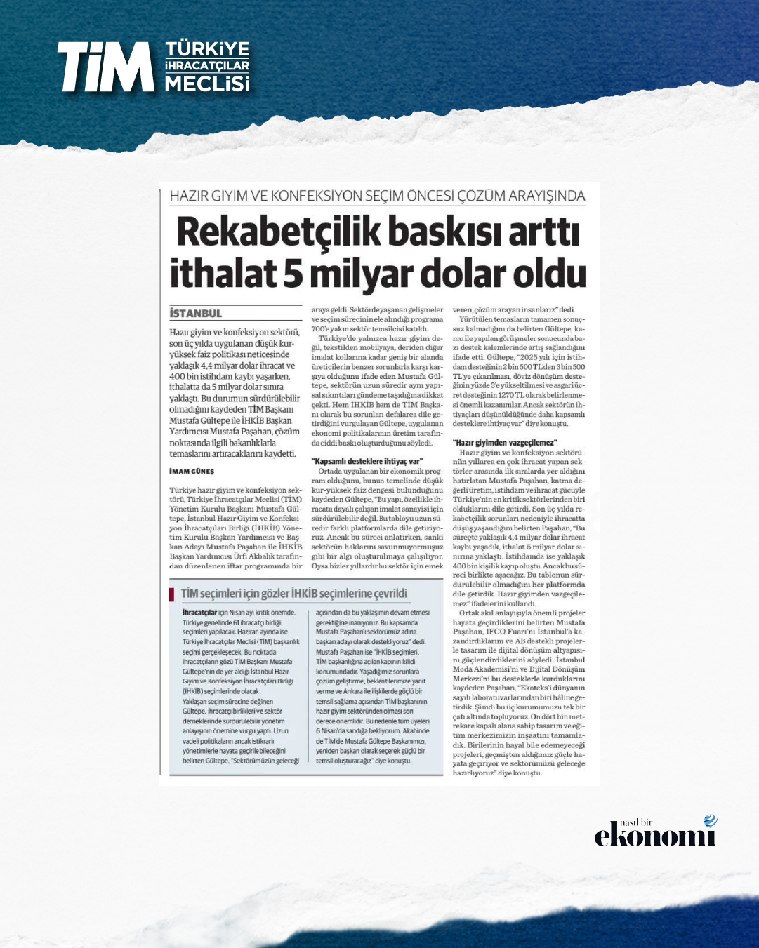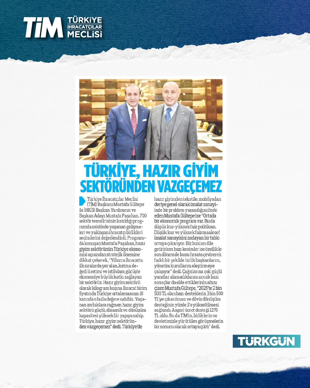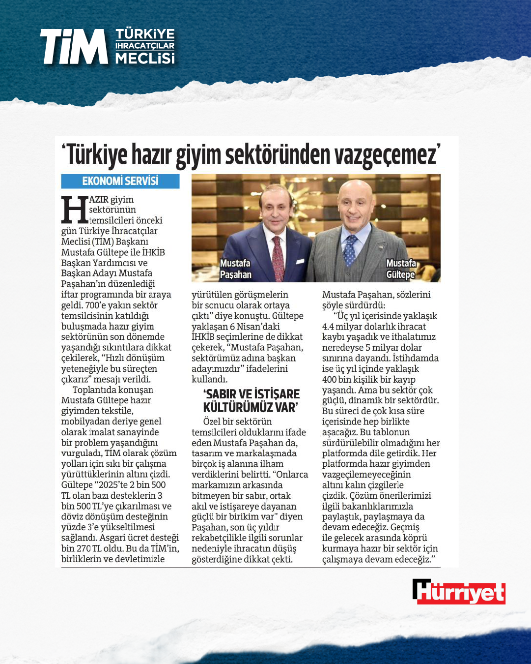 TİM Başkanı Mustafa Gültepe, İHKİB iftar programında sektöre yönelik açıklamalarda bulundu. Gültepe, Türkiye'de hazır giyimden tekstile, mobilyadan deriye genel olarak imalat sanayinde bir problem yaşandığını söyledi. Düşük kur ve yüksek faizin imalat sanayisini zorlayan bir tablo ortaya çıkardığını belirten Gültepe, “Zorluklara rağmen hazır giyim sektörü güçlü ve dönüşüm kapasitesi yüksek bir yapıya sahip. Türkiye, hazır giyim sektöründen vazgeçemez.” dedi.
