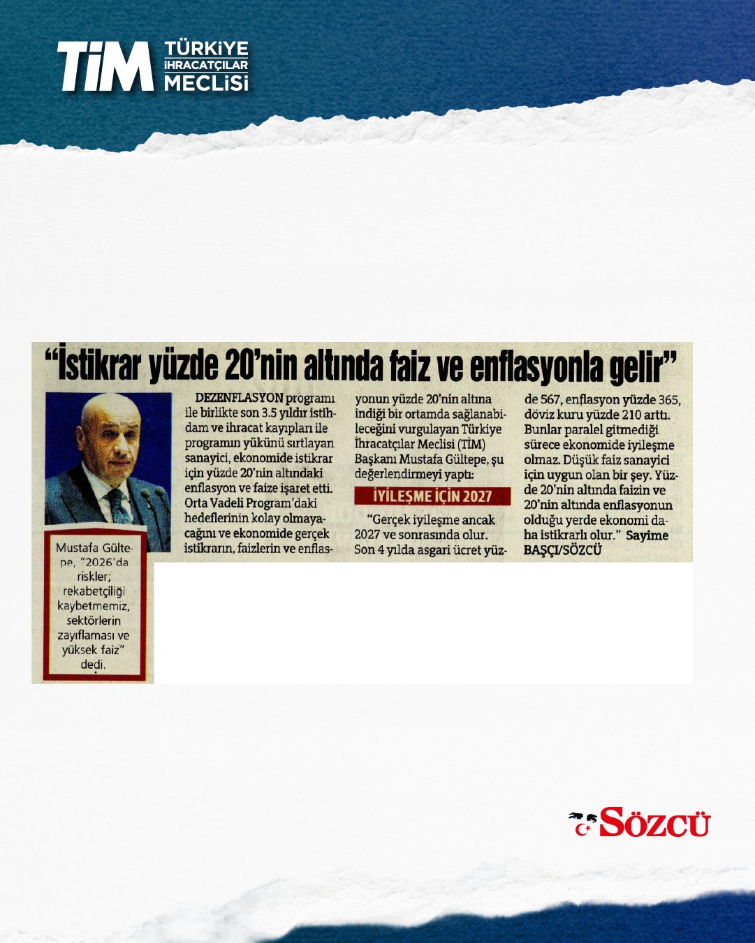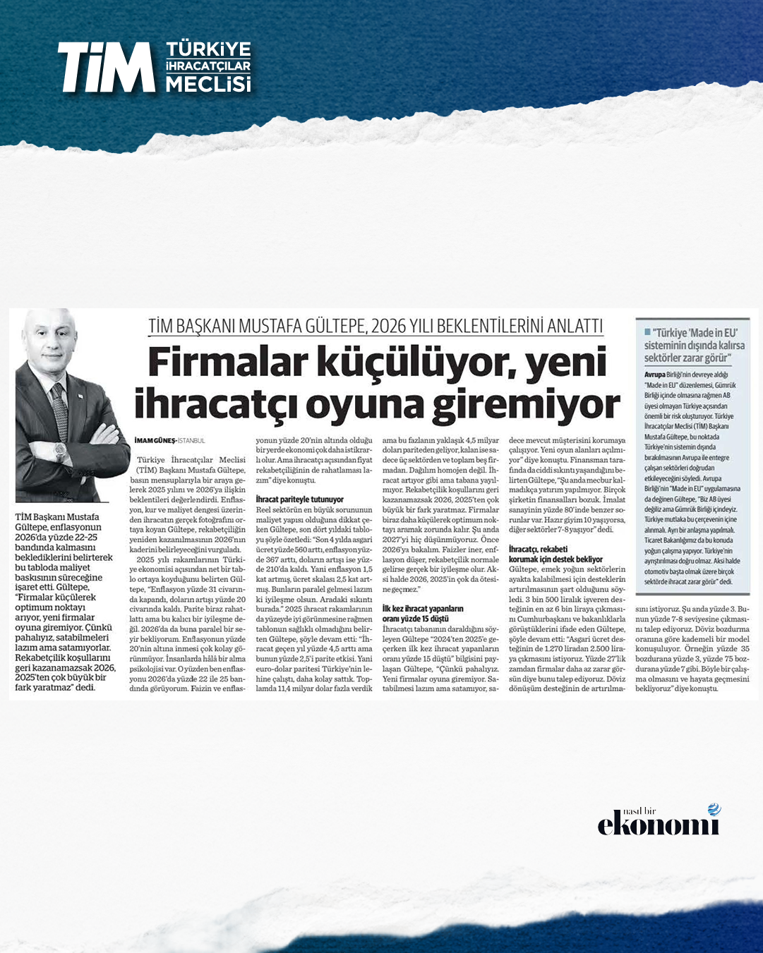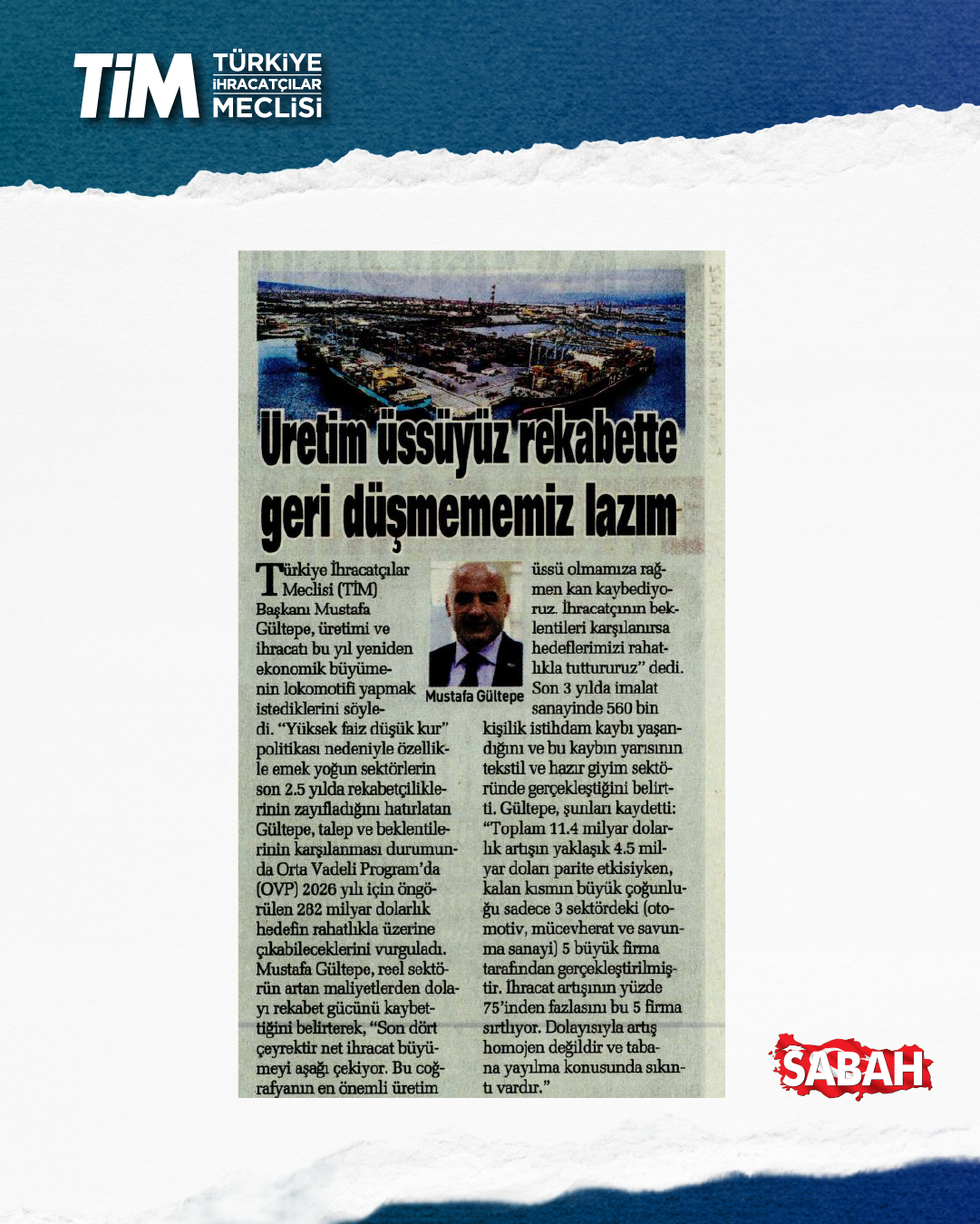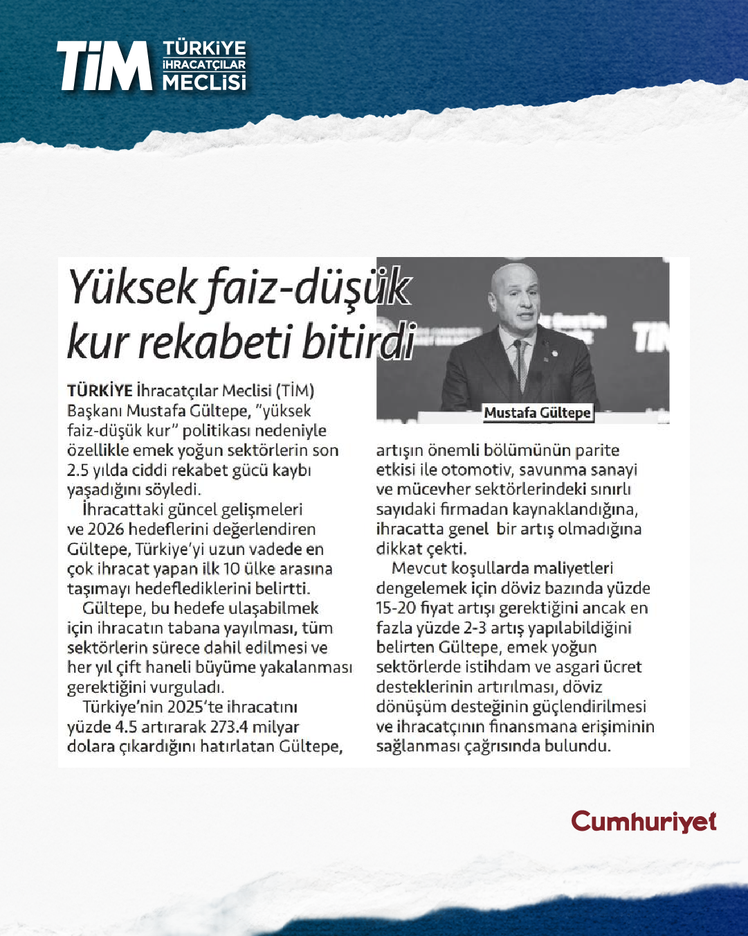 TİM Başkanı Mustafa Gültepe, gazetecilerle bir araya gelerek, ekonomi gündemine dair değerlendirmelerde bulundu. Üretimi ve ihracatı yeniden ekonomik büyümenin lokomotifi yapmaları gerektiğini ifade eden Gültepe, “yüksek faiz-düşük kur” nedeniyle özellikle emek yoğun sektörlerin son 2.5 yılda rekabetçiliklerinin zayıfladığını hatırlattı. Gültepe, “Bu coğrafyanın en önemli üretim üssü olmamıza rağmen kan kaybediyoruz. İhracatçının beklentileri karşılanırsa hedeflerimizi rahatlıkla tuttururuz.” dedi.