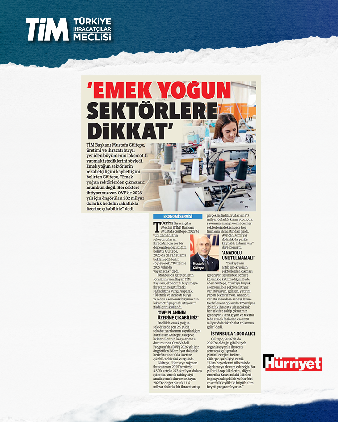 TİM BAŞKANI MUSTAFA GÜLTEPE: İHRACATÇININ BEKLENTİLERİ KARŞILANIRSA HEDEFLERİMİZİ TUTTURURUZ