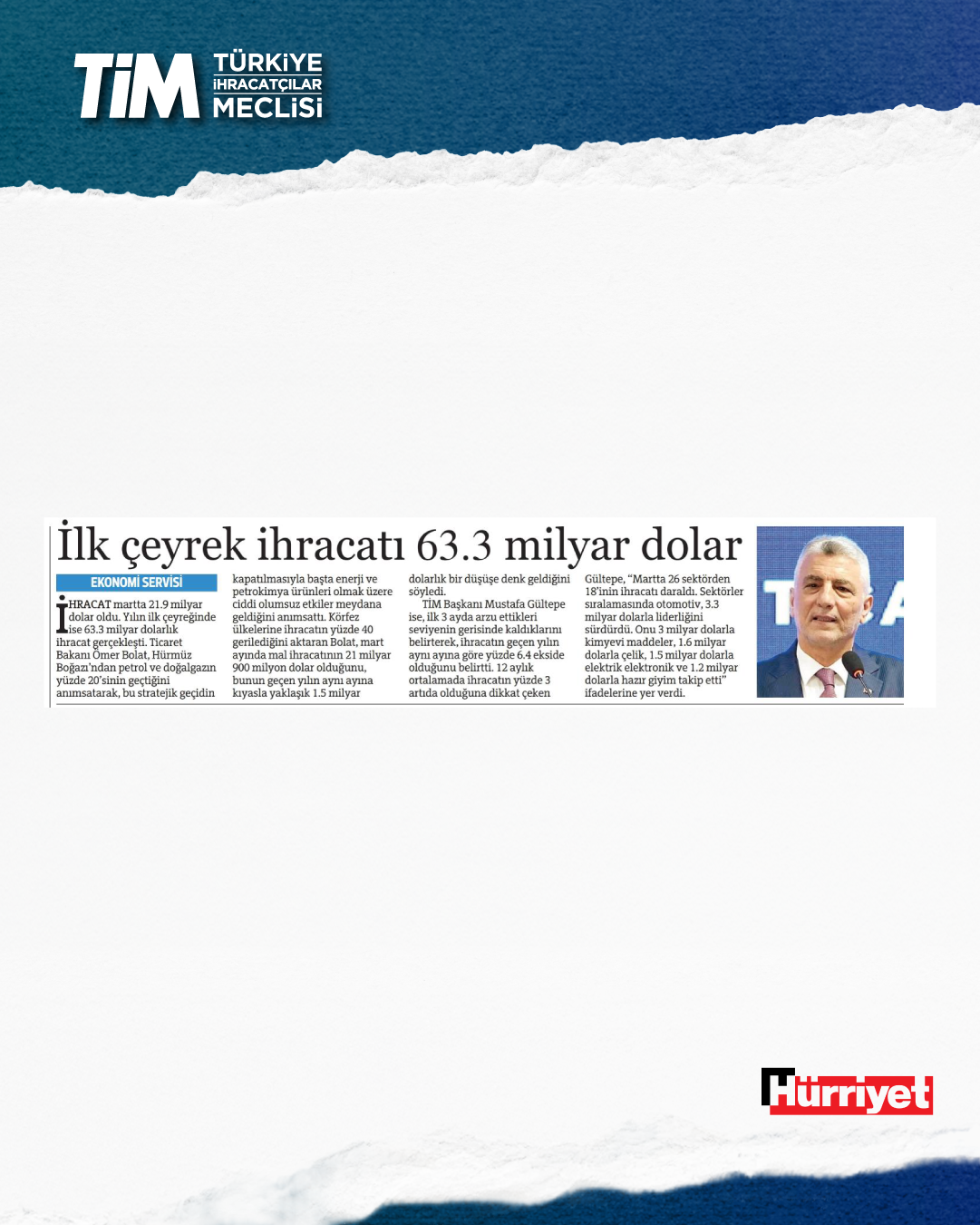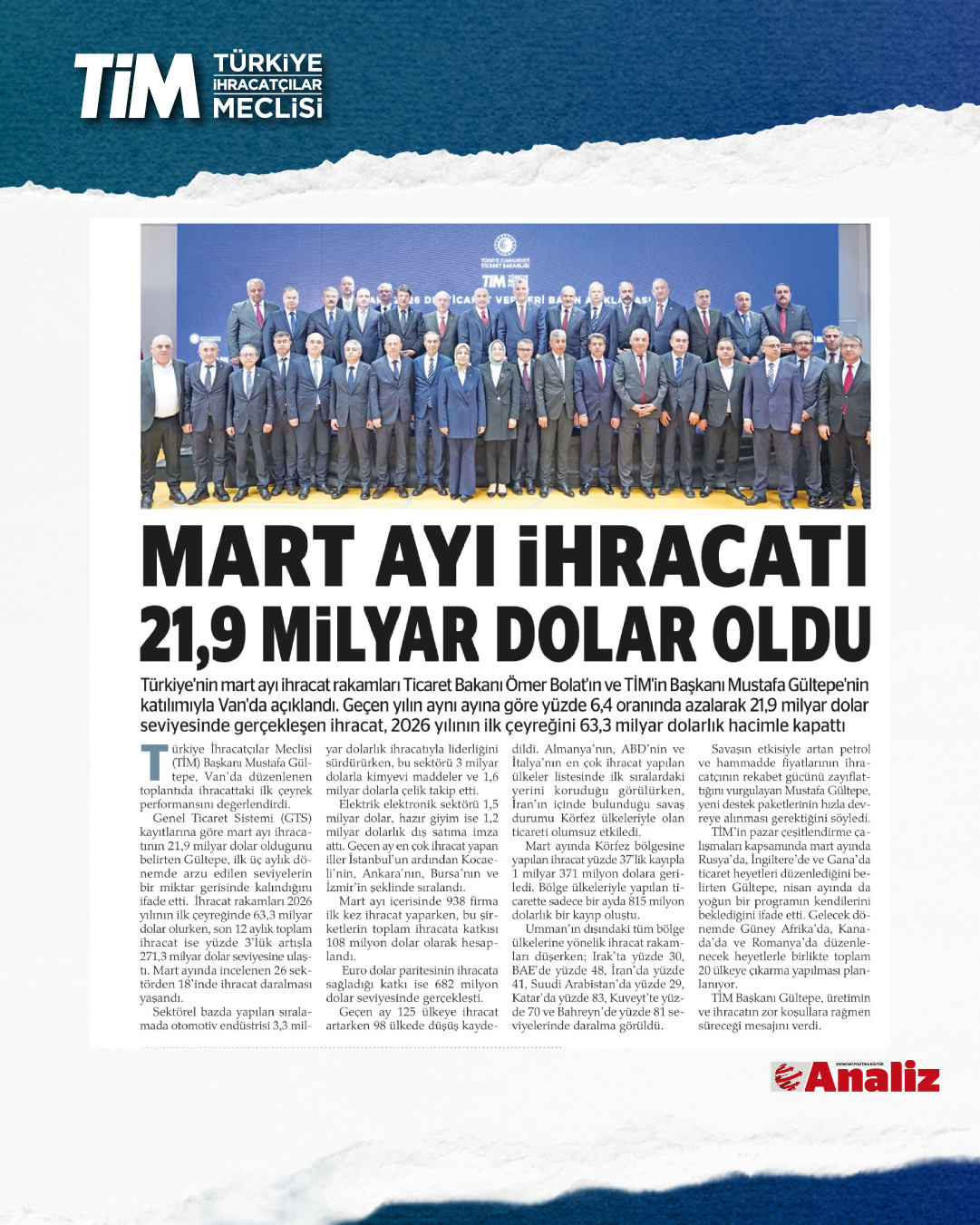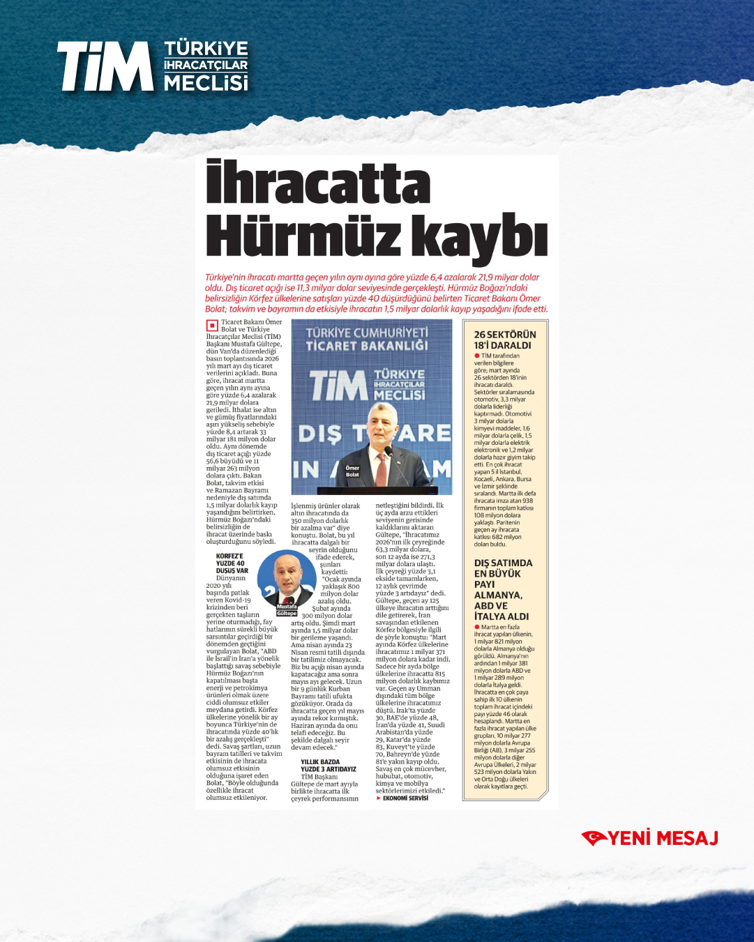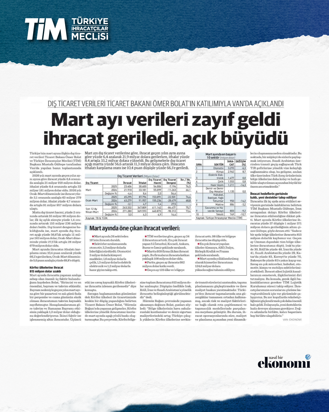 Mart ayı ihracat verileri Ticaret Bakanı Prof. Dr. Ömer Bolat ve TİM Başkanı Mustafa Gültepe tarafından Van'da açıklandı. Türkiye'nin mart ayı ihracatı 21,9 milyar dolar dolar oldu. 2026 yılında ilk çeyrek ihracatı 63,3 milyar dolara, son 12 aylık ihracat ise 271,3 milyar dolara ulaştı. TİM Başkanı Mustafa Gültepe, mart ayıyla birlikte ihracatta ilk çeyrek performansının netleştiğini söyledi. İlk üç ayda arzu ettikleri seviyenin gerisinde kaldıklarını belirten Gültepe, “Bu zor koşullarda rekabetçiliğimizi güçlendirmek çok daha önemli hale geldi. Dolayısıyla, yeni desteklerin hızla devreye alınması gerekiyor. Doğru adımlarla birlikte, kalıcı başarılara hep birlikte ulaşabiliriz.” dedi.