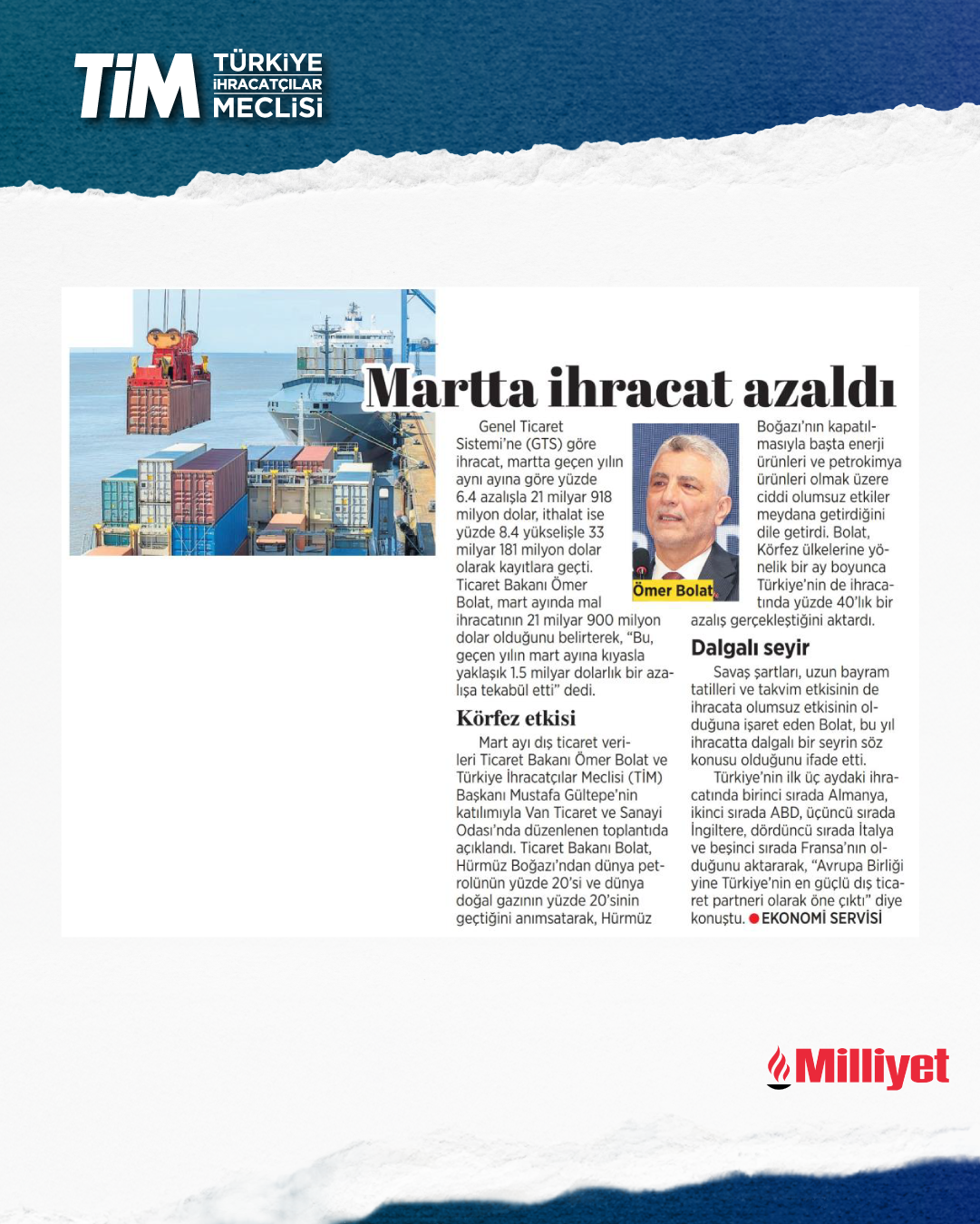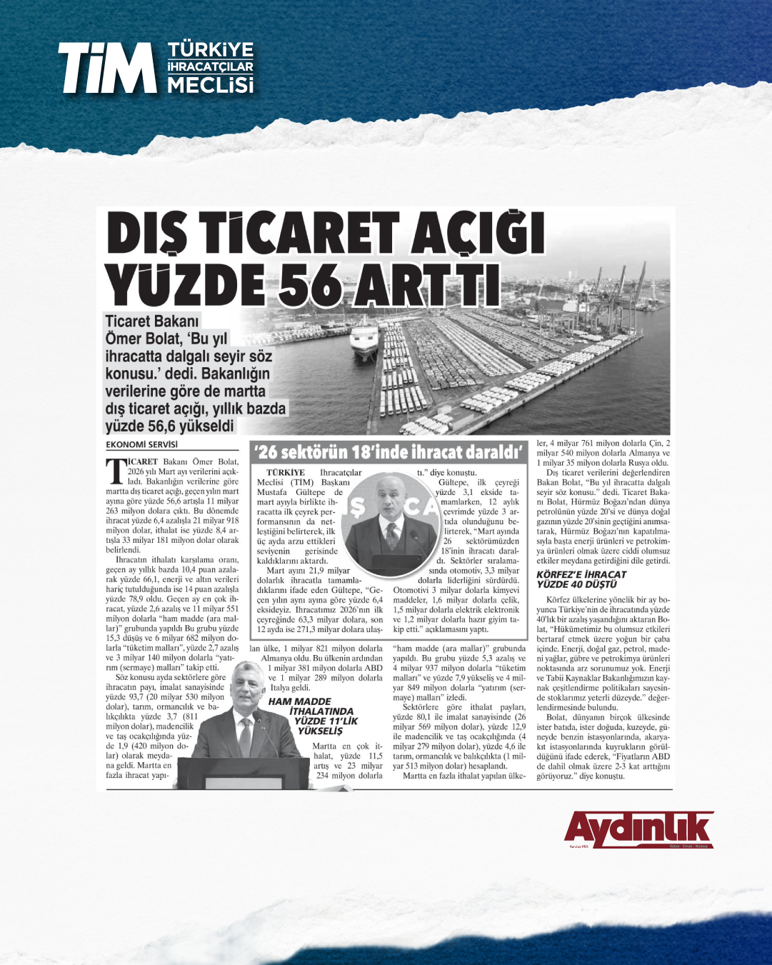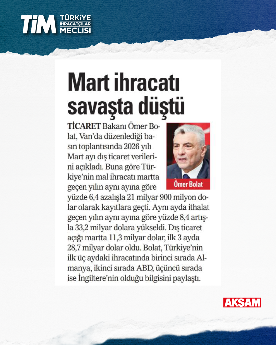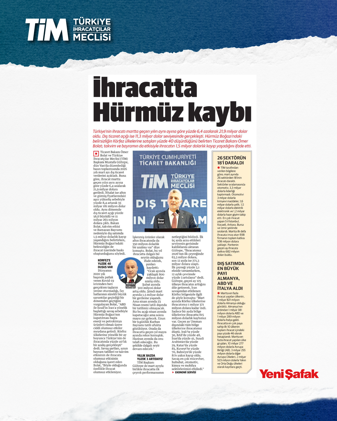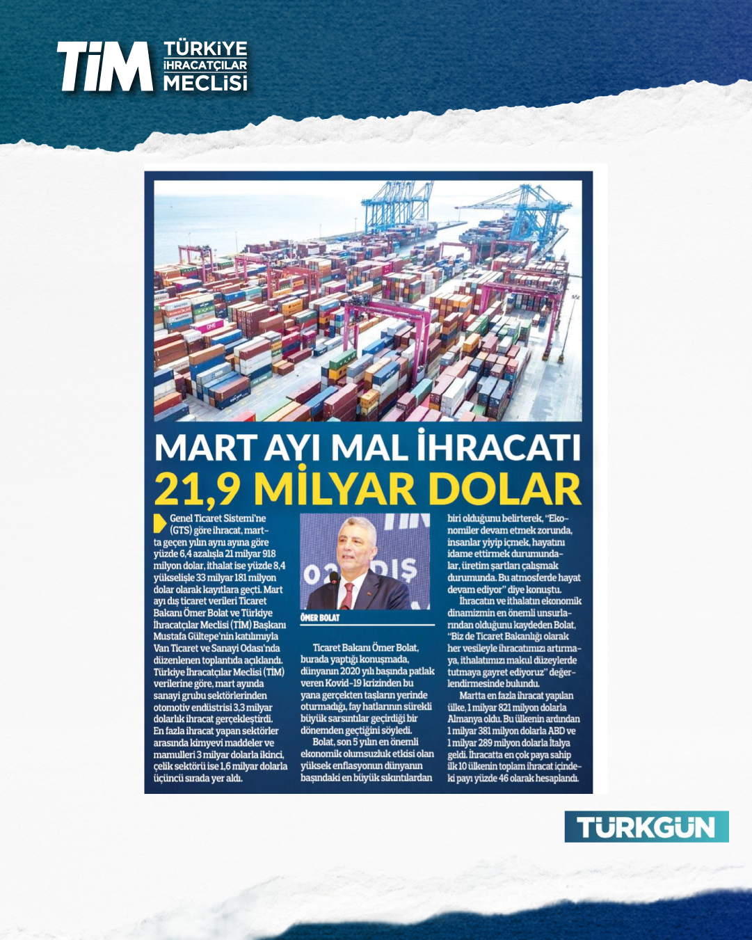 Mart ayı ihracat verileri Ticaret Bakanı Prof. Dr. Ömer Bolat ve TİM Başkanı Mustafa Gültepe tarafından Van'da açıklandı. Türkiye'nin mart ayı ihracatı 21,9 milyar dolar dolar oldu. 2026 yılında ilk çeyrek ihracatı 63,3 milyar dolara, son 12 aylık ihracat ise 271,3 milyar dolara ulaştı. TİM Başkanı Mustafa Gültepe, mart ayıyla birlikte ihracatta ilk çeyrek performansının netleştiğini söyledi. İlk üç ayda arzu ettikleri seviyenin gerisinde kaldıklarını belirten Gültepe, “Bu zor koşullarda rekabetçiliğimizi güçlendirmek çok daha önemli hale geldi. Dolayısıyla, yeni desteklerin hızla devreye alınması gerekiyor. Doğru adımlarla birlikte, kalıcı başarılara hep birlikte ulaşabiliriz.” dedi.