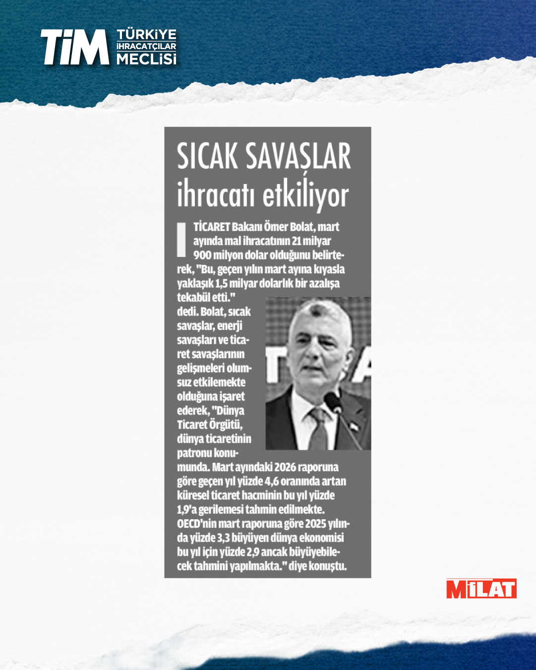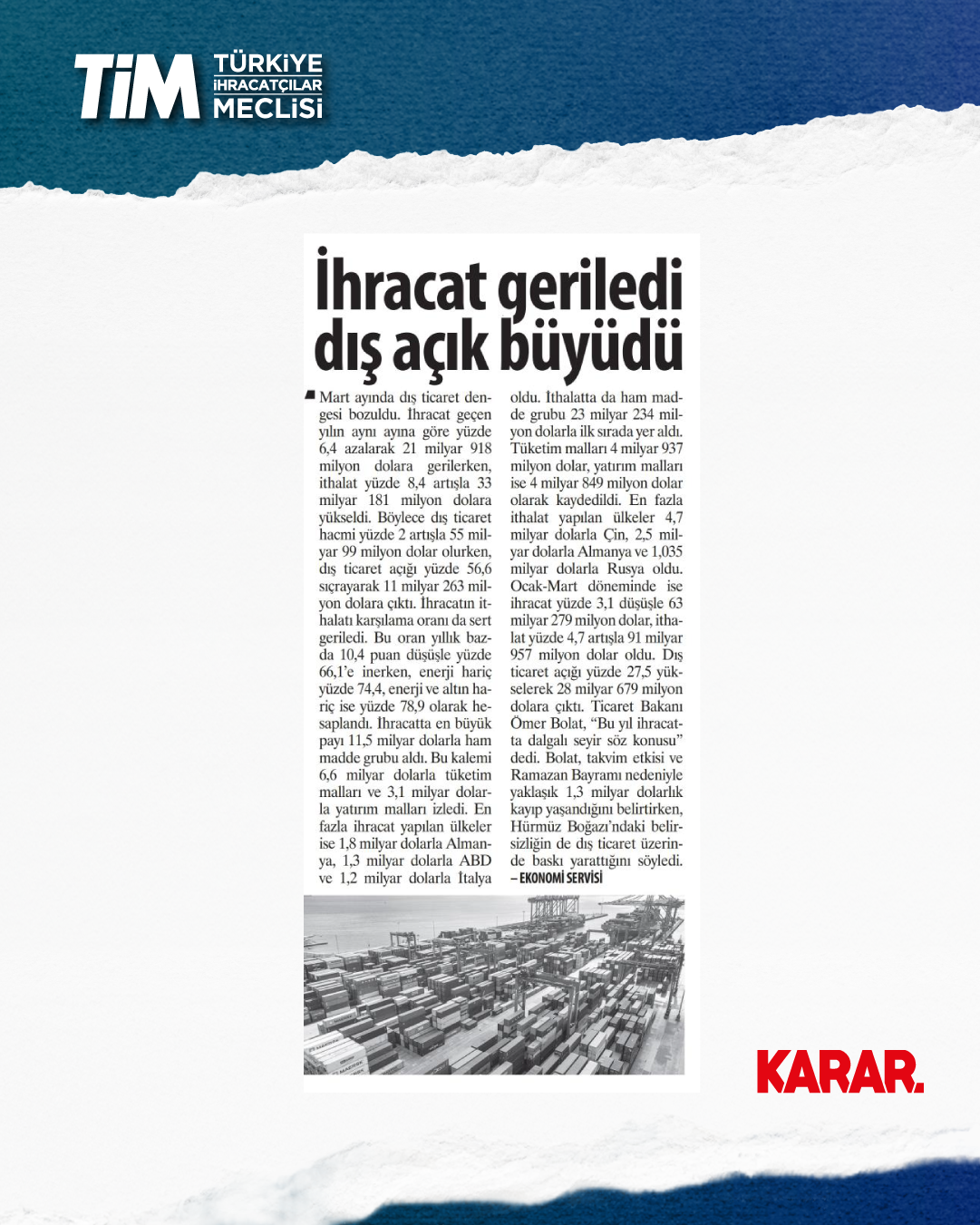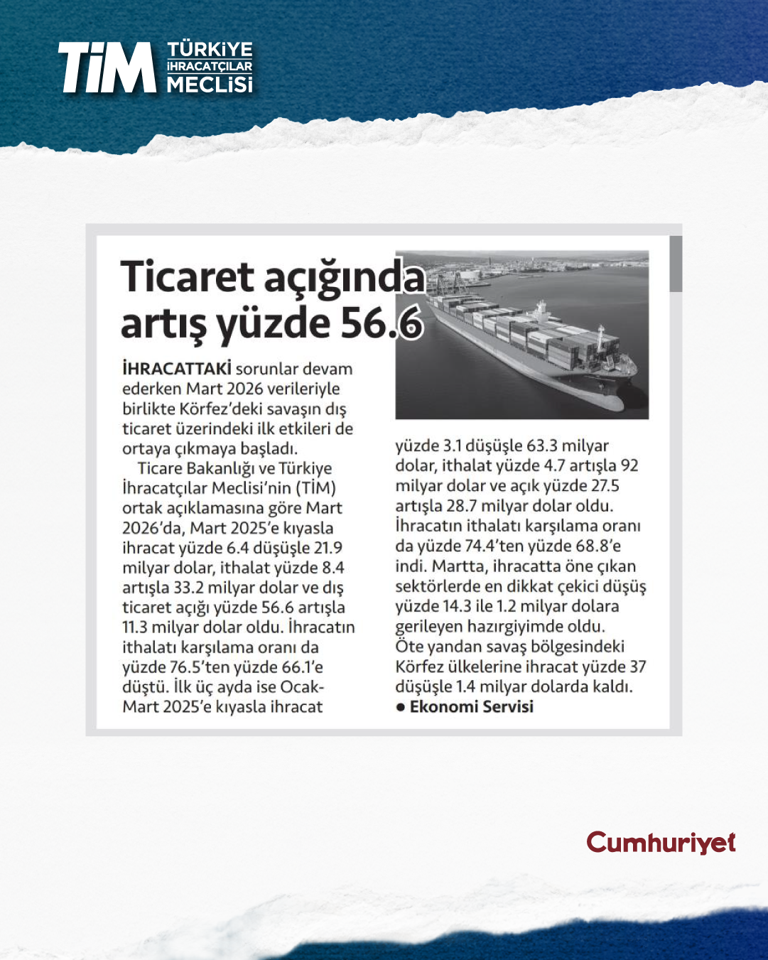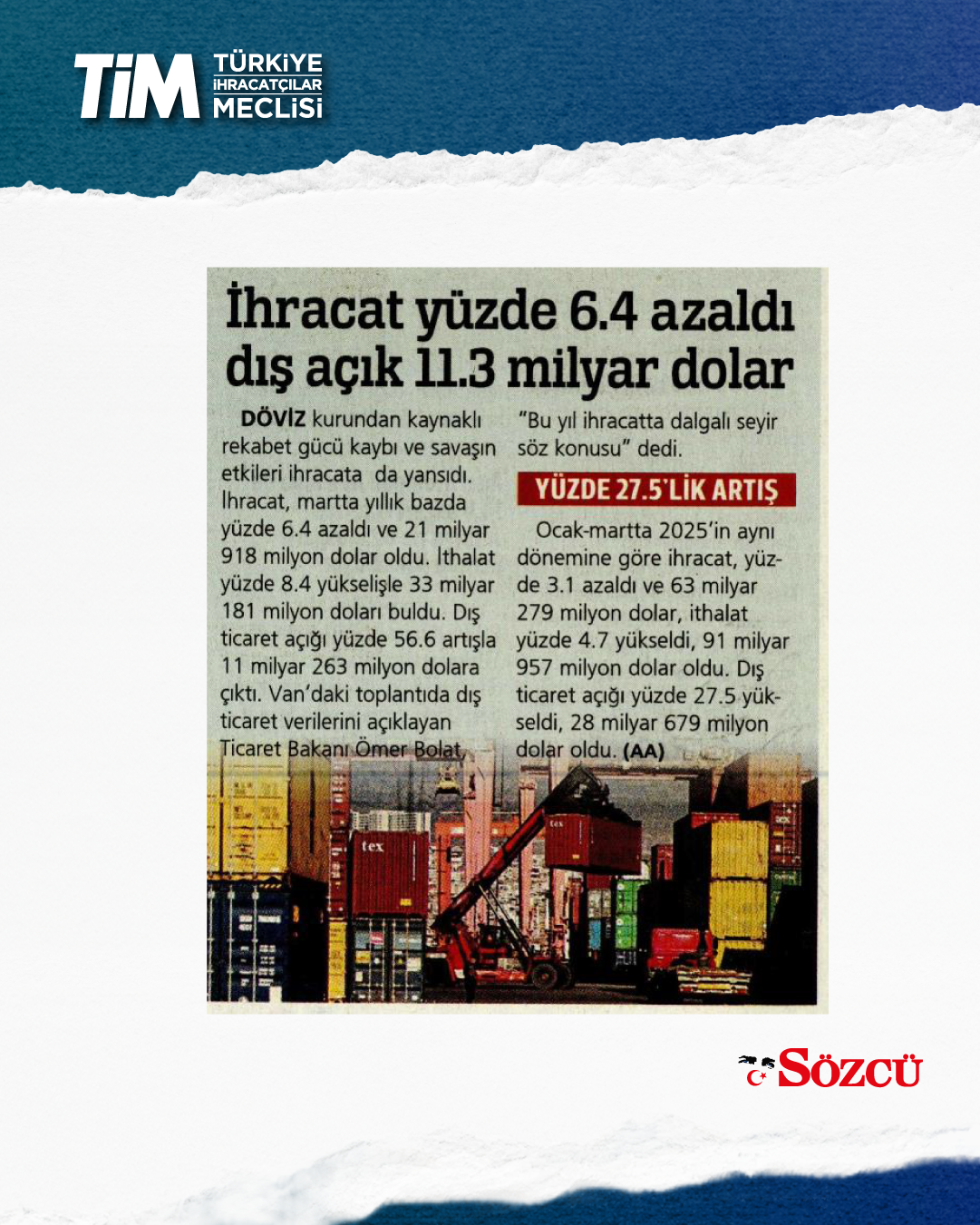 Mart ayı ihracat verileri Ticaret Bakanı Prof. Dr. Ömer Bolat ve TİM Başkanı Mustafa Gültepe tarafından Van'da açıklandı. Türkiye'nin mart ayı ihracatı 21,9 milyar dolar dolar oldu. 2026 yılında ilk çeyrek ihracatı 63,3 milyar dolara, son 12 aylık ihracat ise 271,3 milyar dolara ulaştı. TİM Başkanı Mustafa Gültepe, mart ayıyla birlikte ihracatta ilk çeyrek performansının netleştiğini söyledi. İlk üç ayda arzu ettikleri seviyenin gerisinde kaldıklarını belirten Gültepe, “Bu zor koşullarda rekabetçiliğimizi güçlendirmek çok daha önemli hale geldi. Dolayısıyla, yeni desteklerin hızla devreye alınması gerekiyor. Doğru adımlarla birlikte, kalıcı başarılara hep birlikte ulaşabiliriz.” dedi.