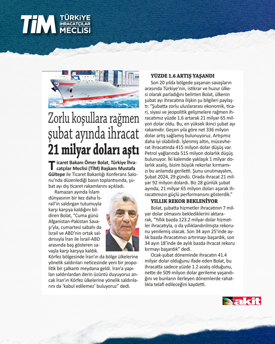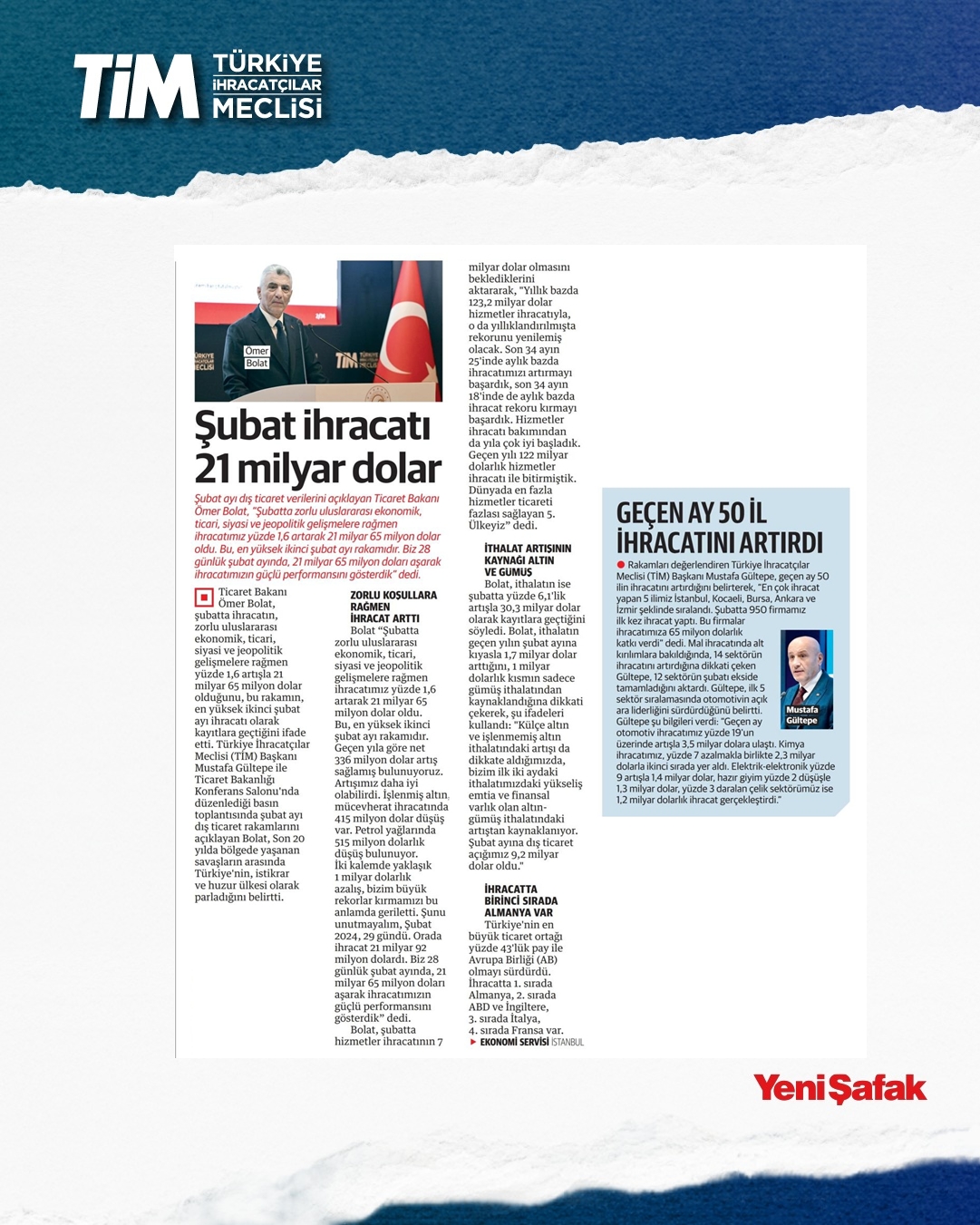 Türkiye'nin şubat ayı ihracatı yüzde 1,6 artışla 21 milyar dolar 65 milyon dolar oldu. Ocak-şubat döneminde iki aylık ihracat 41,4, son 12 aylık ihracat ise 272,8 milyar dolar düzeyinde gerçekleşti. TİM Başkanı Mustafa Gültepe, konuşmasında sağlıklı ve sürdürülebilir büyümenin üretim ve ihracatla sağlanabileceği yönündeki görüşünü yineledi. Açıklanan büyüme verilerini bu gözle değerlendirdiklerini belirten Gültepe, “2025'in hiçbir çeyreğinde net ihracat büyümeye katkı sunamadı. Oysa biz büyümenin en az yarısının üretim ve ihracattan gelmesi gerektiğini düşünüyoruz.” dedi.