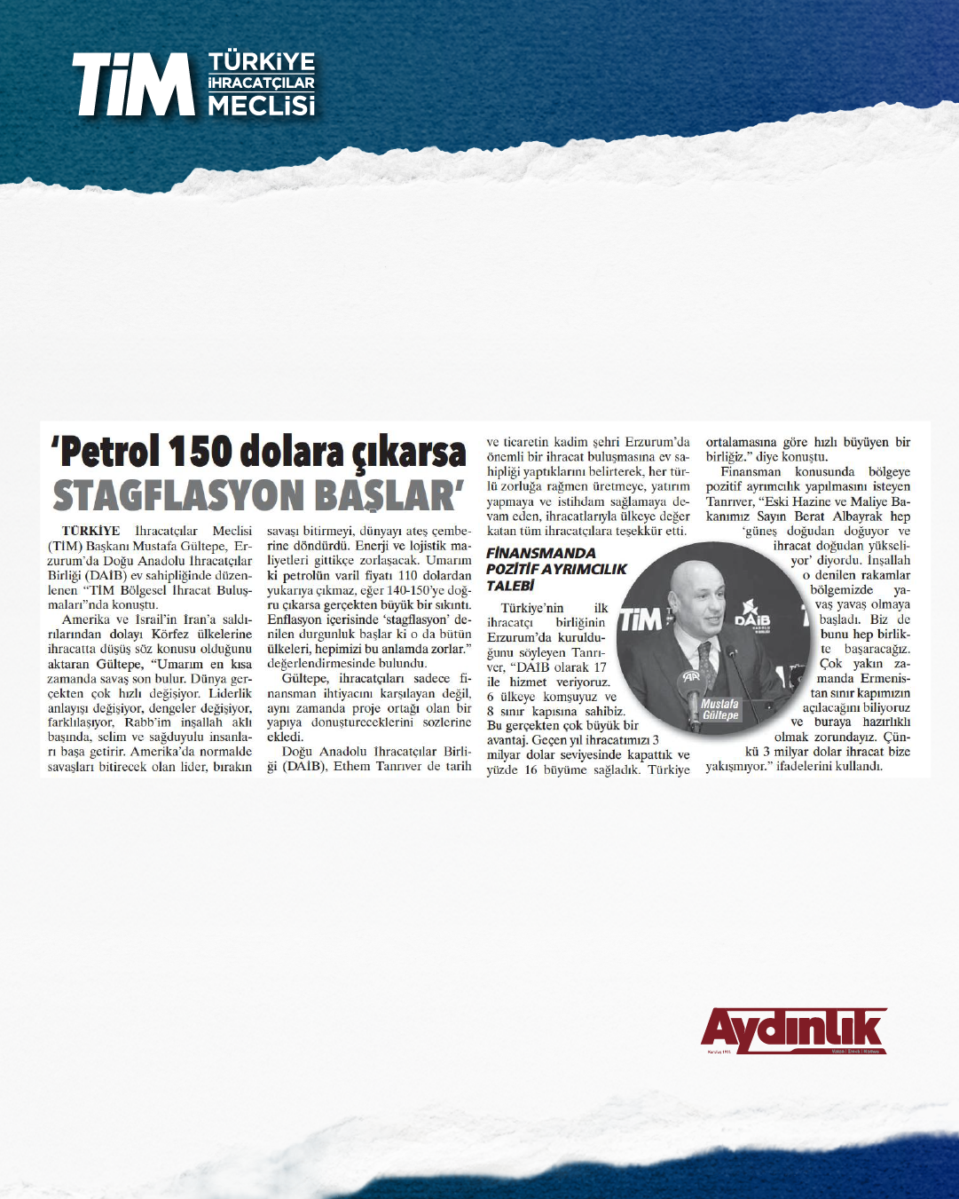 TİM Bölgesel İhracatçı Buluşmaları” programının dokuzuncusu, Doğu Anadolu İhracatçılar Birliğinin (DAİB) ev sahipliğinde Erzurum'da gerçekleştirildi. Programın açılışında konuşan TİM Başkanı Mustafa Gültepe, Ortadoğu'da yaşanan savaş ve çatışma ortamının, ticaret akışını doğrudan etkilediğini belirtti. Gültepe, “Açık konuşmak gerekirse petrol fiyatlarının 100 doların üzerine çıkması bile ciddi bir risk. 140-150 dolar seviyeleri ise küresel anlamda büyük bir sıkıntı oluşturur. Bu da enflasyonla birlikte durgunluğu, yani stagflasyonu beraberinde getirir.” dedi.