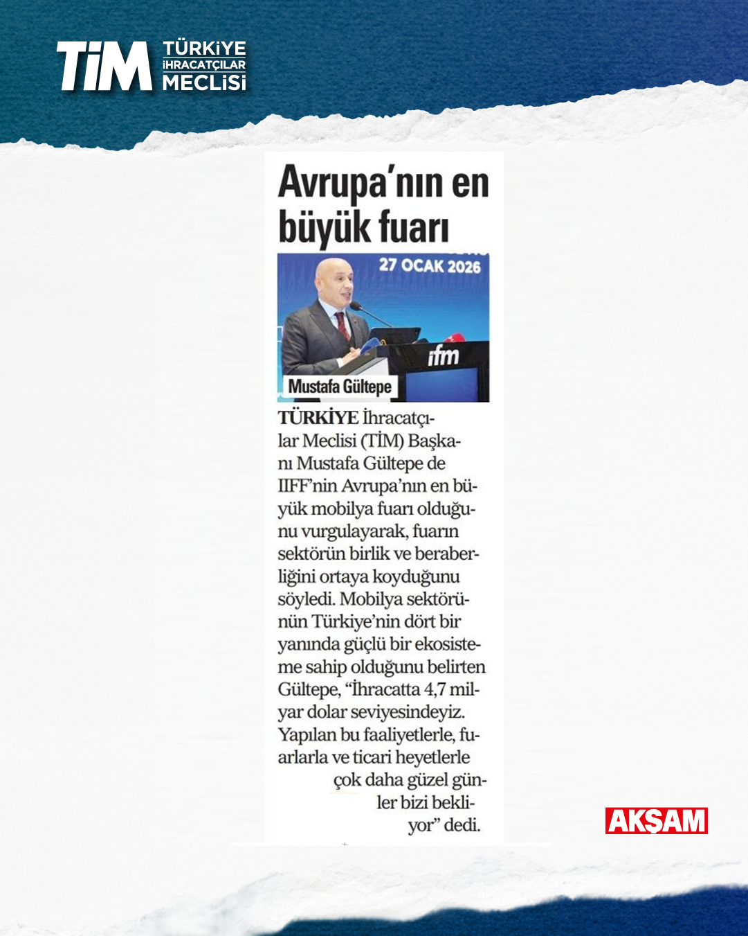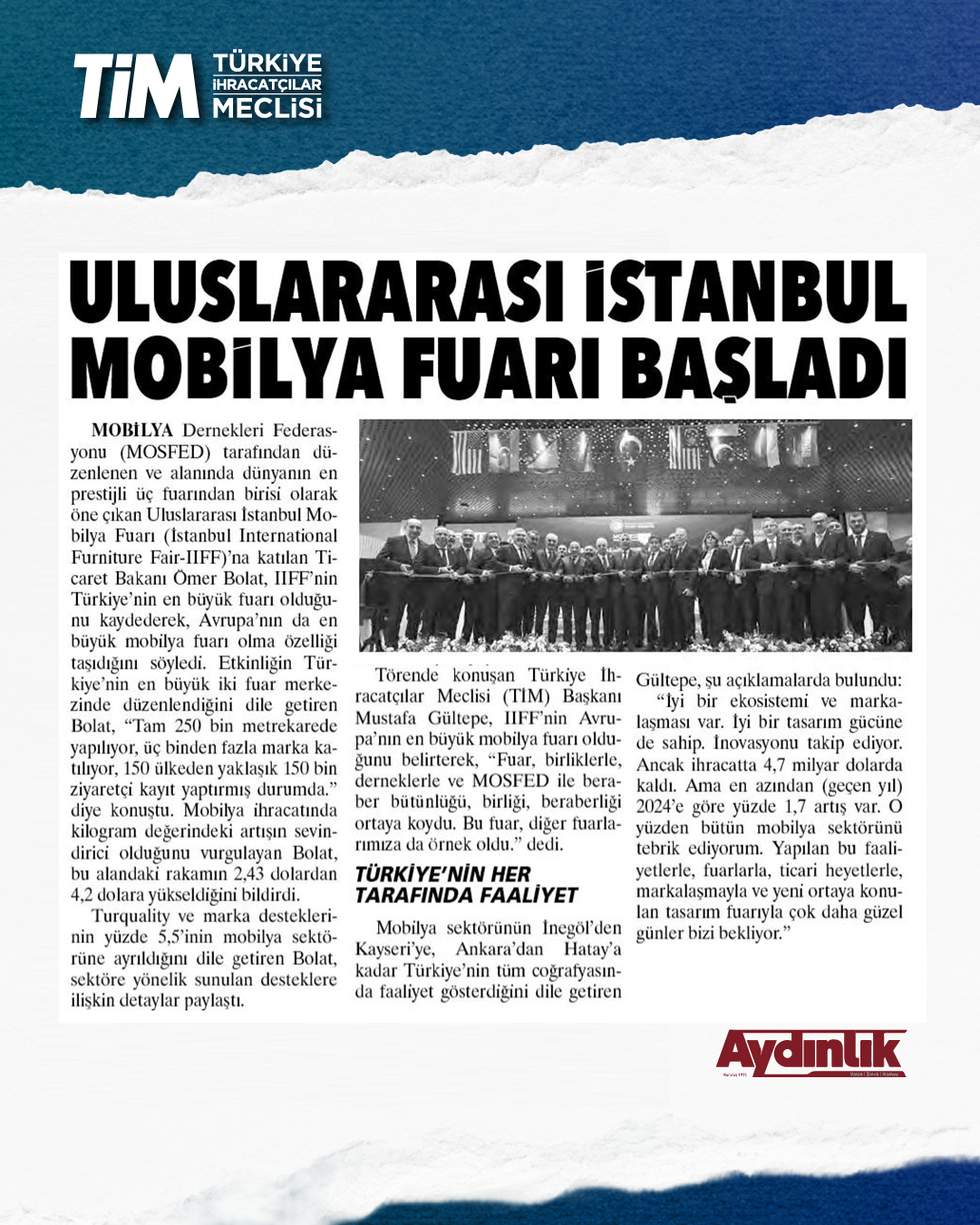 Uluslararası İstanbul Mobilya Fuarı (IIFF) 2026, İstanbul Fuar Merkezi ve TÜYAP Fuar Merkezi'nde başladı. Fuarın açılışında konuşan TİM Başkanı Mustafa Gültepe, IIFF'nin Avrupa'nın en büyük mobilya fuarı olduğunu vurguladı. Gültepe, “Mobilya ihracatında 4,7 milyar dolar seviyesindeyiz. Yapılan bu faaliyetlerle, fuarlarla ve ticari heyetlerle çok daha güzel günler bizi bekliyor.” dedi.