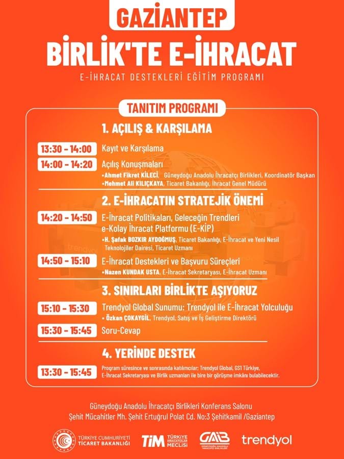 E-ihracat ekosisteminde daha fazla firmamızın devlet desteklerinden yararlanabilmesi için Ticaret Bakanlığı, Türkiye İhracatçılar Meclisi (TİM) ve Trendyol iş birliğiyle hayata geçirilen eğitim programlarının üçüncüsü Güneydoğu Anadolu İhracatçı Birlikleri (GAİB) ev sahipliğinde Gaziantep'te gerçekleştirilecektir.