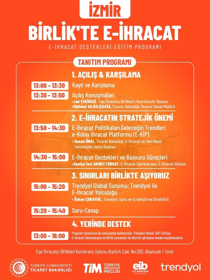E-ihracat ekosisteminde daha fazla firmamızın devlet desteklerinden yararlanabilmesi için Ticaret Bakanlığı, Türkiye İhracatçılar Meclisi (TİM) ve Trendyol iş birliğiyle hayata geçirilen, ilki Bursa'da gerçekleştirilen eğitim programlarının ikincisi Ege İhracatçı Birlikleri (EİB) ev sahipliğinde İzmir'de gerçekleştirilecektir.