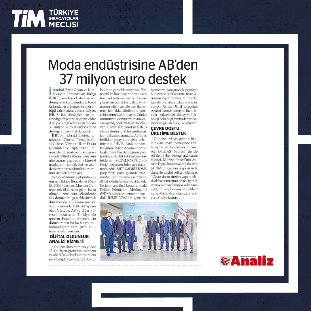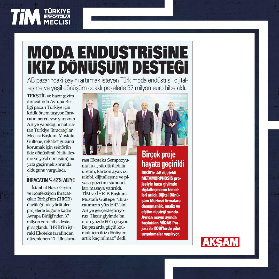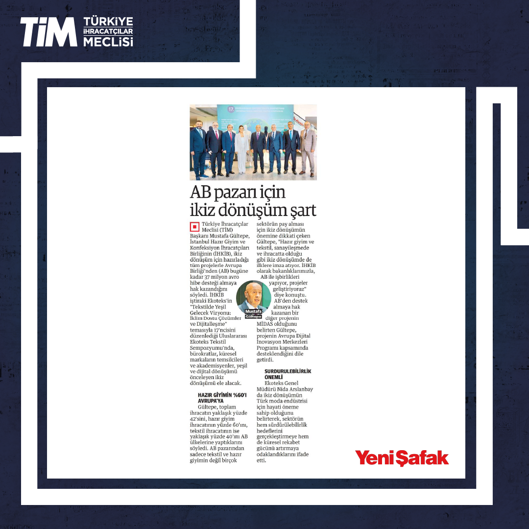 İHKİB tarafından düzenlenen 17'nci Uluslararası Ekoteks Tekstil Sempozyumu, "Tekstilde Yeşil Gelecek Vizyonu: İklim Dostu Çözümler ve Dijitalleşme" temasıyla gerçekleştirildi. Programda konuşan TİM Başkanı Mustafa Gültepe, Türkiye'nin toplam ihracatının yaklaşık yüzde 42'sini, hazır giyim ihracatının yüzde 60'ını, tekstil ihracatının ise yaklaşık yüzde 40'ını AB ülkelerine gerçekleştirdiğini belirtti. Gültepe, “Biz, tüm sektörlerimizin bu büyük pazardan çok daha fazla pay almasını istiyoruz. Bunun için ikiz dönüşümü gerçekleştirmek zorundayız.” dedi.