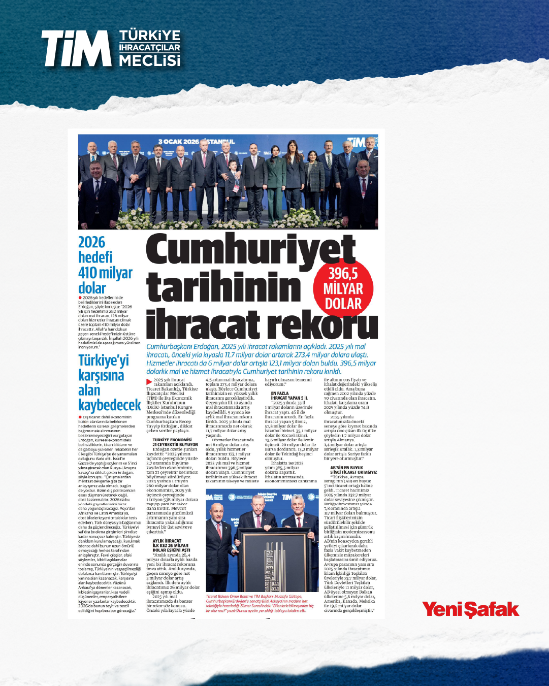2025 yılı ihracat verileri Cumhurbaşkanı Recep Tayyip Erdoğan'ın da katıldığı toplantıyla İstanbul'da açıklandı. Aralıkta yüzde 12,8 artan ihracat, 26,4 milyar dolarla tüm zamanların en yüksek aylık değerine ulaştı. Yıllık ihracat ise 4,5 artışla 273,4 milyar doların üzerine çıktı. TİM Başkanı Mustafa Gültepe konuşmasında 2025 yılının ihracatçılar için zor geçtiğinin altını çizdi. Özellikle emek yoğun sektörlerin rekabetçiliğini kaybetmesi nedeniyle ihracatı tabana yaymakta zorlandıklarını vurgulayan Gültepe, “İhracatı yeniden ekonominin lokomotifi haline getirmeliyiz.” dedi.