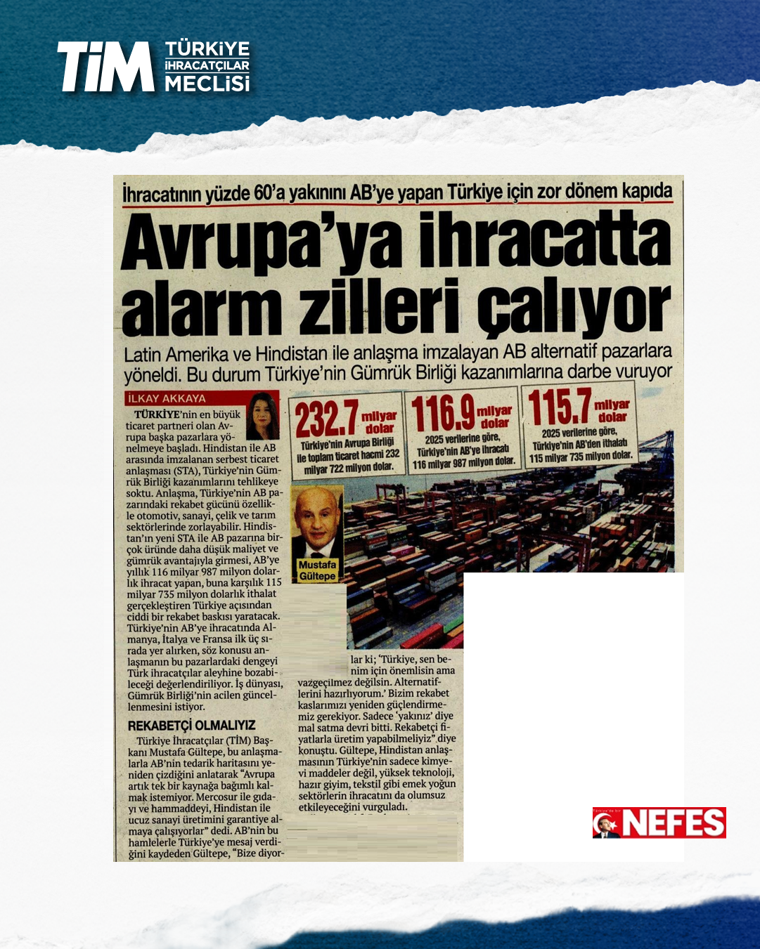 TİM Başkanı Mustafa Gültepe, AB ile Hindistan arasında imzalanan Serbest Ticaret Anlaşmasına ilişkin değerlendirmelerde bulundu. Avrupa'nın artık tek bir kaynağa bağımlı kalmak istemediğine dikkat çeken Gültepe, AB'nin tedarik haritasını yeniden çizdiğini ifade etti. Gültepe, “Hindistan halen Asya'nın en rekabetçi ülkelerinden biri. Emek yoğun sektörlerimizin AB'ye ihracatında kayıp yaşayabiliriz. Bu koşullarda Hindistan ile fiyat odaklı rekabet etme şansımız yok.” dedi.