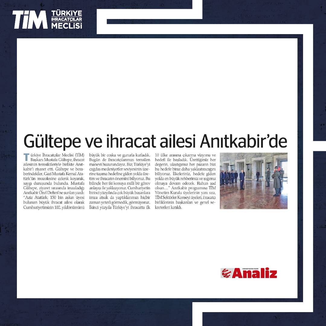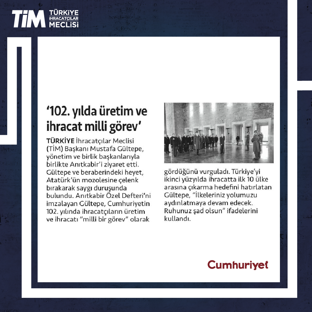 TİM Başkanı Mustafa Gültepe, ihracat ailesinin temsilcileriyle birlikte Anıtkabir'i ziyaret etti. Gültepe ve beraberindeki heyet, Atatürk'ün mozolesine çelenk bırakarak saygı duruşunda bulundu. Anıtkabir Özel Defteri'ni imzalayan Gültepe, Cumhuriyetin 102. yılında ihracatçıların üretim ve ihracatı “milli bir görev” olarak gördüğünü vurguladı. Türkiye'yi ikinci yüzyılda ihracatta ilk 10 ülke arasına çıkarma hedefini hatırlatan Gültepe, “İlkeleriniz yolumuzu aydınlatmaya devam edecek. Ruhunuz şad olsun.” ifadelerini kullandı.