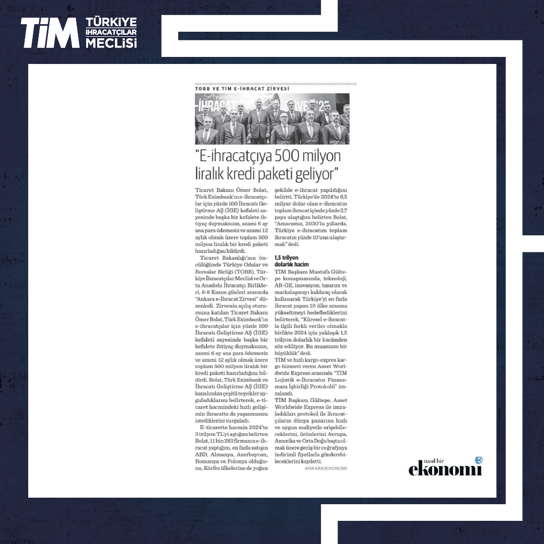 Ticaret Bakanlığı öncülüğünde, TOBB, TİM ve OAİB iş birliğiyle düzenlenen “Ankara e-İhracat Zirvesi” başladı. TİM Başkanı Mustafa Gültepe, zirvede yaptığı konuşmada Türkiye'yi en çok ihracat yapan ilk 10 ülke arasına çıkarmayı hedeflediklerini ifade etti. Küresel e-ihracat pazarının 2024'te 1.5 trilyon dolar büyüklüğe ulaştığını belirten Gültepe, “2030'da e ihracatın payını yüzde 10'a çıkarabiliriz” dedi. Zirvede TİM ile Asset Worldwide Express arasında iş birliği mutabakatı imzalandı. Mutabakat kapsamında, TİM üyeleri, AwwEx dijital platformu üzerinden yapacakları e-ihracat gönderilerinde yüzde 15 indirim avantajı elde edecek.