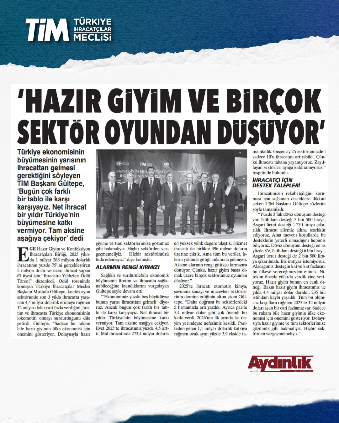 Ege Hazır Giyim ve Konfeksiyon İhracatçıları Birliği, Hazır Giyim ve Konfeksiyon İhracatının Yıldızları 2025 Yılı Ödül Töreni düzenledi. 67 ihracatçı firma ödüle layık görüldü. Ödül töreninde konuşan TİM Başkanı Mustafa Gültepe, artan maliyetler ve kur-enflasyon dengesizliği nedeniyle başta hazır giyim olmak üzere birçok sektörün rekabet gücünü kaybettiğini söyledi. Gültepe, “Türkiye'nin büyümesi güzel ama net ihracatın büyümeye katkısı yok. Üretim ağırlıklı büyümeliyiz. Böylece önümüzdeki dönemlerde ortaya koyacağımız hedefleri daha kolay tutturabiliriz.” dedi.