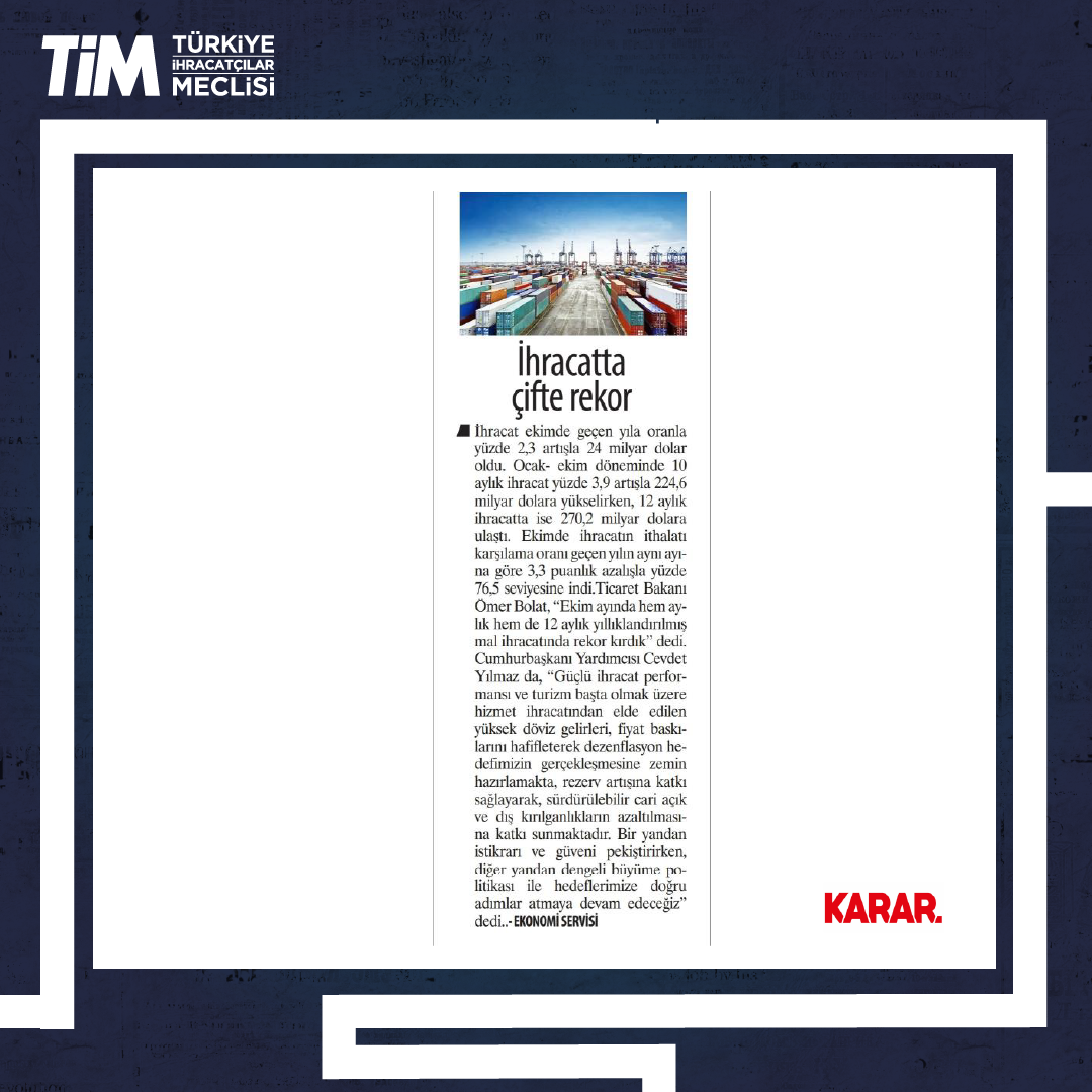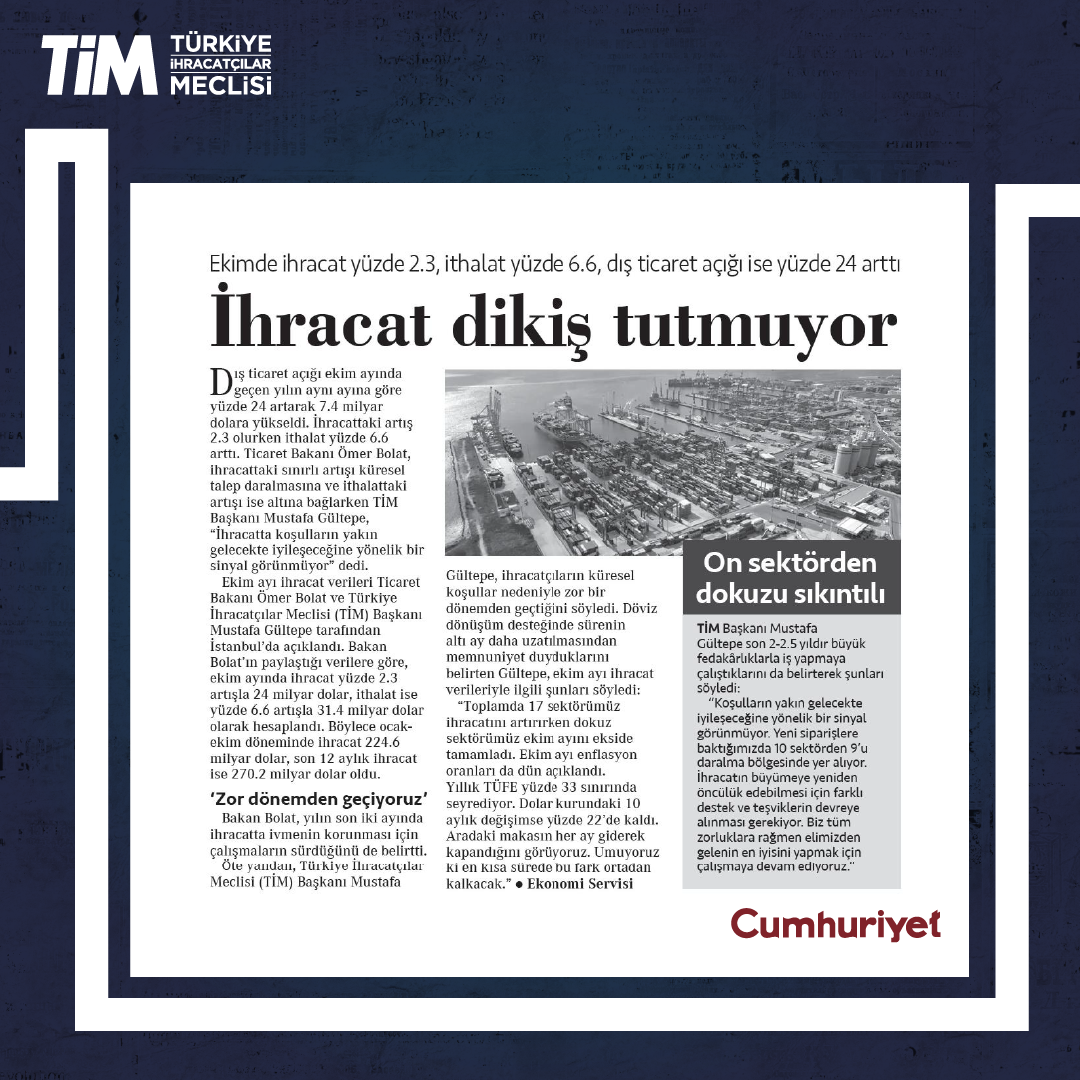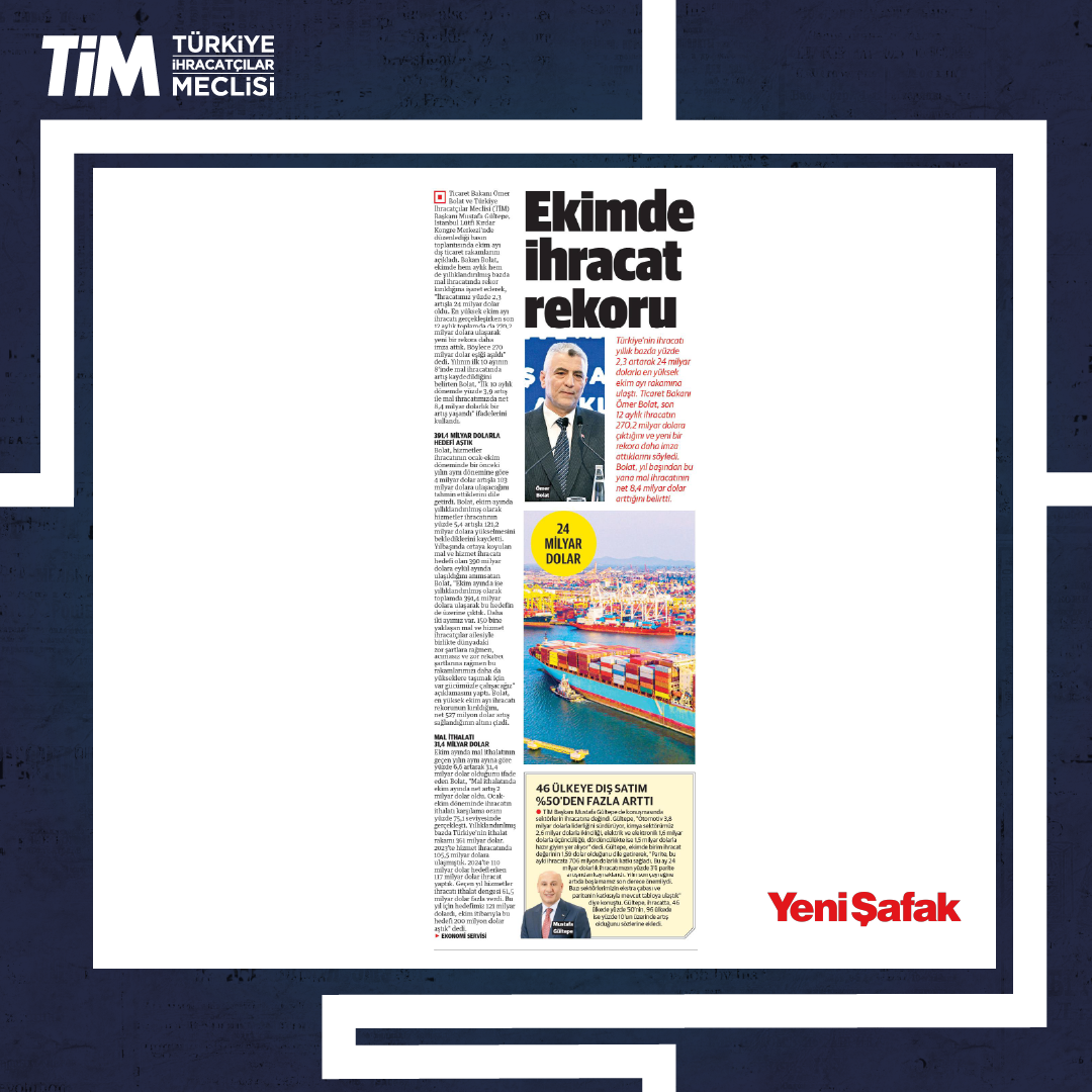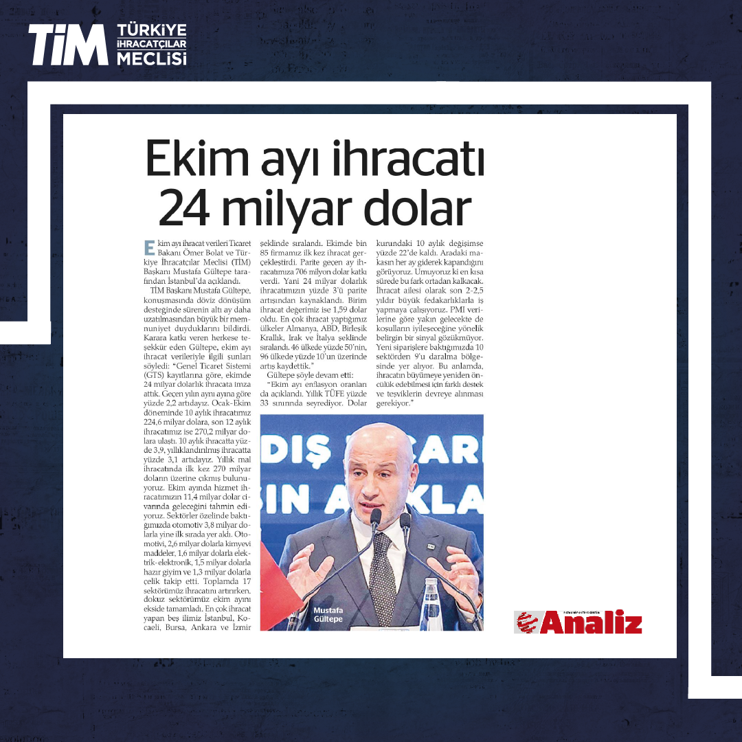 Ekim ayı ihracat verileri Ticaret Bakanı Prof. Dr. Ömer Bolat ve TİM Başkanı Mustafa Gültepe tarafından İstanbul'da açıklandı. Türkiye'nin ekim ayı ihracatı 24 milyar dolar oldu. Ocak-Ekim döneminde 10 aylık ihracat 224,6  milyar dolara, son 12 aylık ihracat ise 270,2 milyar dolara ulaştı. TİM Başkanı Mustafa Gültepe, döviz dönüşüm desteğinde sürenin altı ay daha uzatılmasından büyük bir memnuniyet duyduklarını bildirdi. Gültepe, “İhracat ailesi olarak son 2,5 yıldır büyük fedakârlıklarla iş yapmaya çalışıyoruz. İhracatın büyümeye yeniden öncülük edebilmesi için farklı destek ve teşviklerin devreye alınması gerekiyor.” dedi.