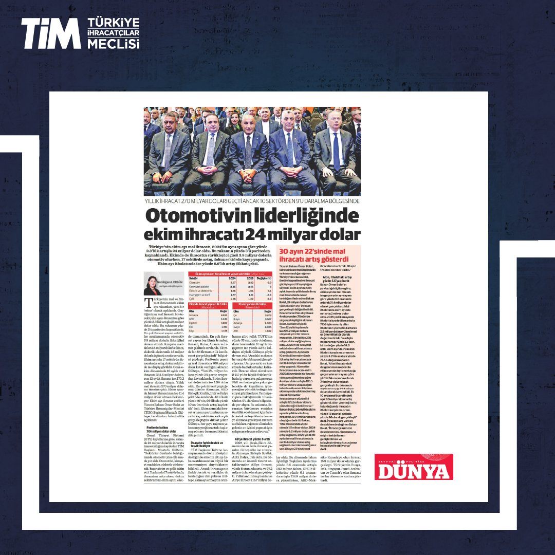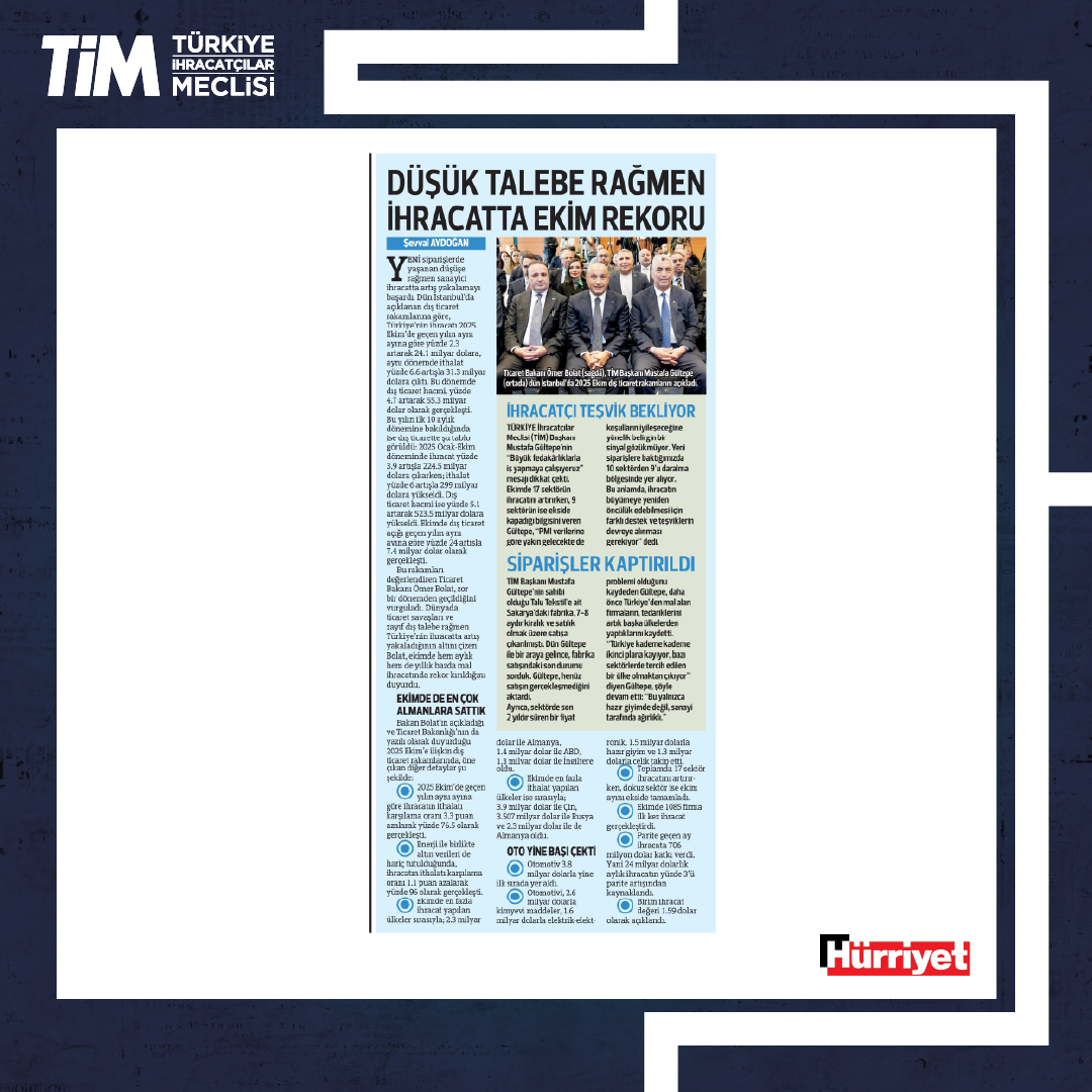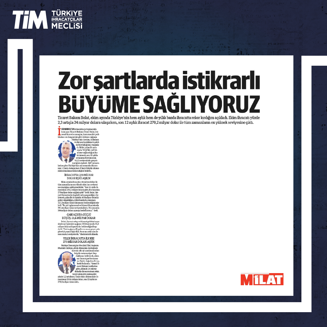 Ekim ayı ihracat verileri Ticaret Bakanı Prof. Dr. Ömer Bolat ve TİM Başkanı Mustafa Gültepe tarafından İstanbul'da açıklandı. Türkiye'nin ekim ayı ihracatı 24 milyar dolar oldu. Ocak-Ekim döneminde 10 aylık ihracat 224,6  milyar dolara, son 12 aylık ihracat ise 270,2 milyar dolara ulaştı. TİM Başkanı Mustafa Gültepe, döviz dönüşüm desteğinde sürenin altı ay daha uzatılmasından büyük bir memnuniyet duyduklarını bildirdi. Gültepe, “İhracat ailesi olarak son 2,5 yıldır büyük fedakârlıklarla iş yapmaya çalışıyoruz. İhracatın büyümeye yeniden öncülük edebilmesi için farklı destek ve teşviklerin devreye alınması gerekiyor.” dedi.