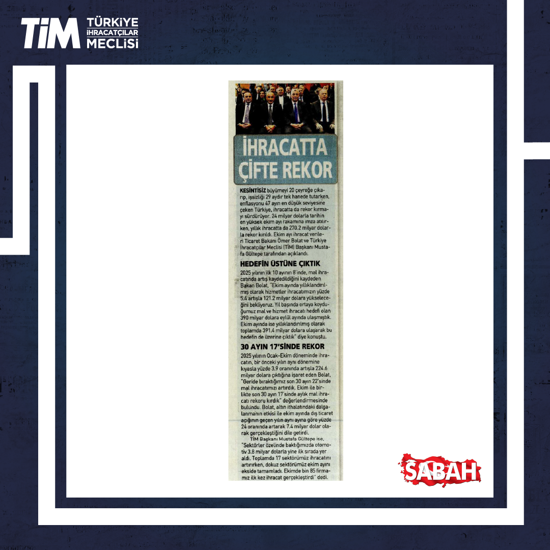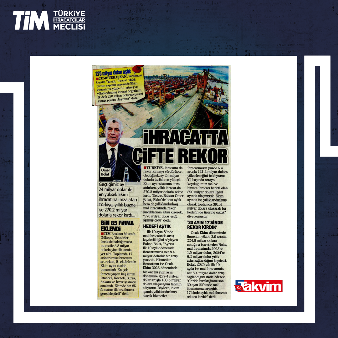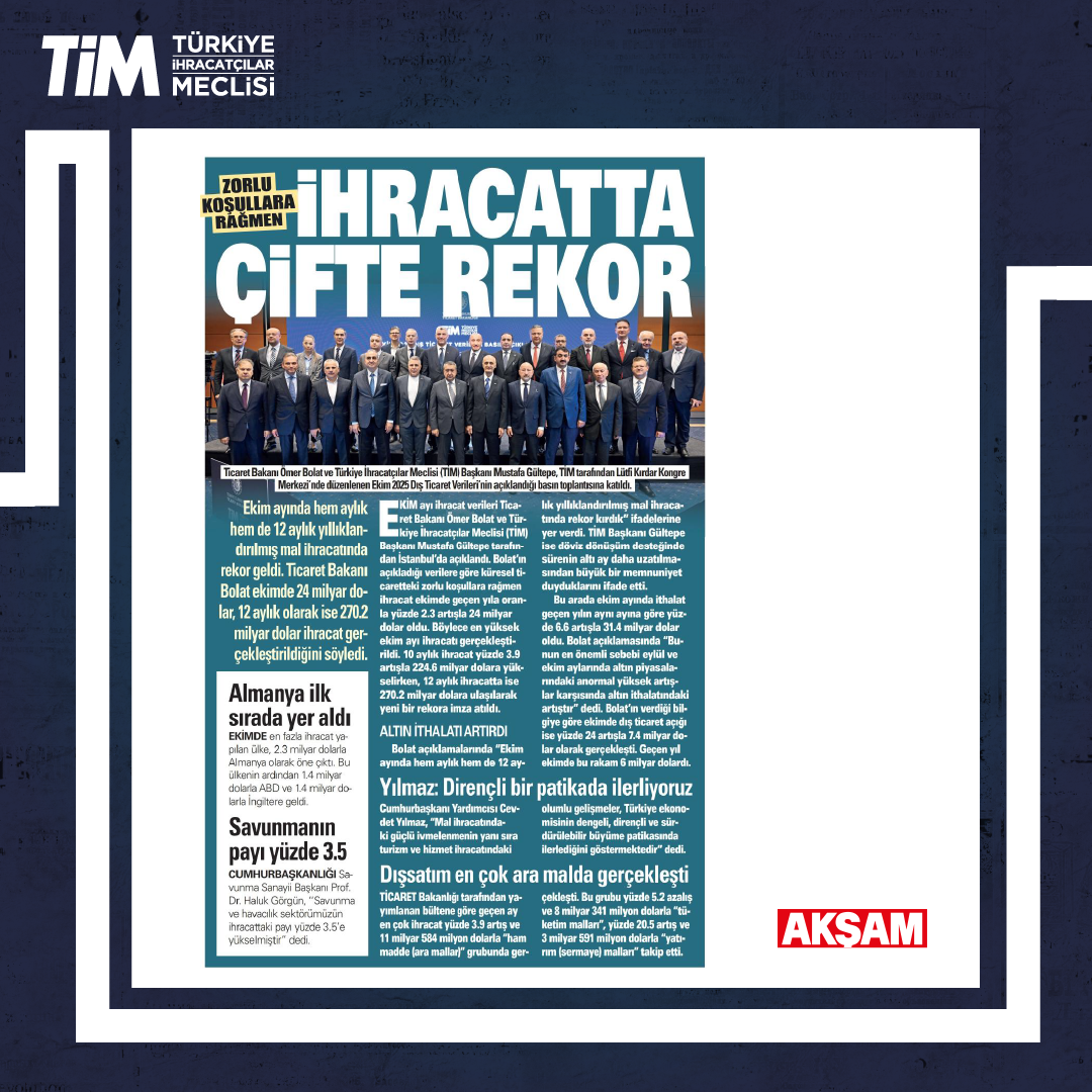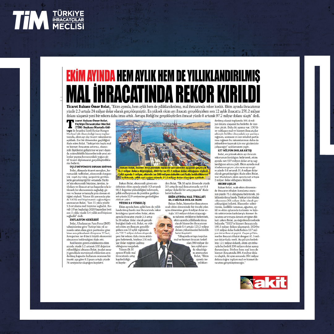 Ekim ayı ihracat verileri Ticaret Bakanı Prof. Dr. Ömer Bolat ve TİM Başkanı Mustafa Gültepe tarafından İstanbul'da açıklandı. Türkiye'nin ekim ayı ihracatı 24 milyar dolar oldu. Ocak-Ekim döneminde 10 aylık ihracat 224,6  milyar dolara, son 12 aylık ihracat ise 270,2 milyar dolara ulaştı. TİM Başkanı Mustafa Gültepe, döviz dönüşüm desteğinde sürenin altı ay daha uzatılmasından büyük bir memnuniyet duyduklarını bildirdi. Gültepe, “İhracat ailesi olarak son 2,5 yıldır büyük fedakârlıklarla iş yapmaya çalışıyoruz. İhracatın büyümeye yeniden öncülük edebilmesi için farklı destek ve teşviklerin devreye alınması gerekiyor.” dedi.