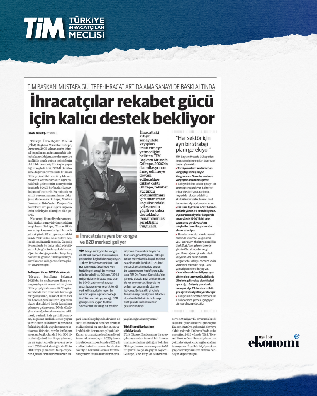 TİM Başkanı Mustafa Gültepe, ihracata dair son gelişmeler ile ilgili Ekonomi Gazetesi'ne değerlendirmelerde bulundu. İhracattaki artışın sanayideki kayıpları telafi etmeye yetmediğini belirten TİM Başkanı Mustafa Gültepe, 2026'da da enflasyonun ihraç edilmeye devam edileceğine dikkat çekti. Gültepe, “Kurun artmadığı noktada maliyeti korumak zorundayız. 2026 yılında önceliklerimizden biri de 2025 yılı maliyetlerini korumak olacak. Ancak ilgili bakanlıklarımız tarafından yeni ve farklı desteklerin ortaya çıkacağına inanıyorum.” dedi.