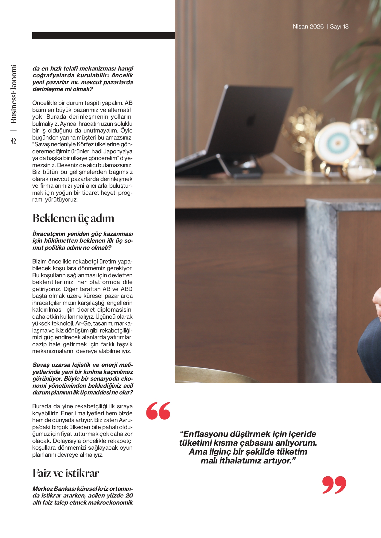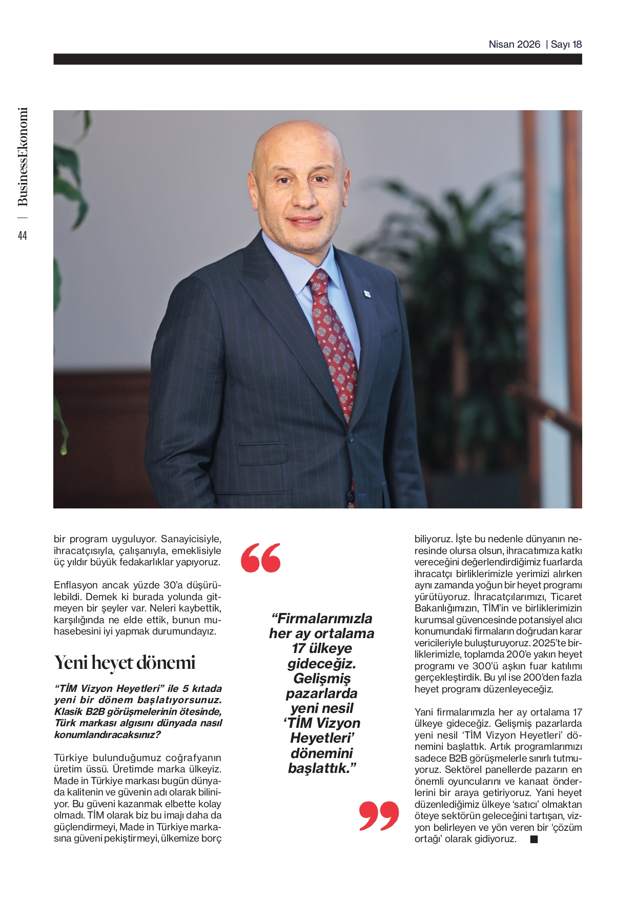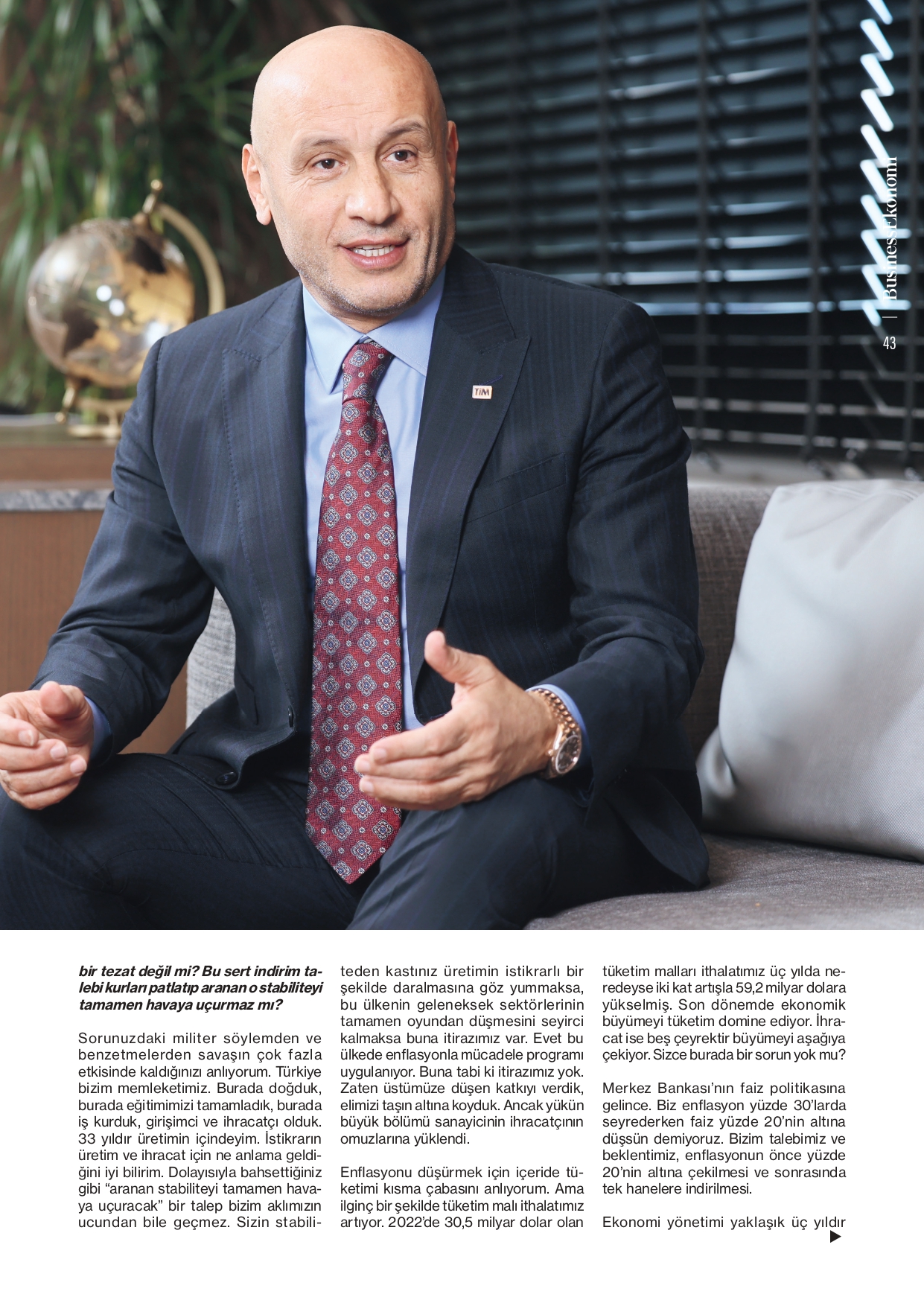 TİM Başkanı Mustafa Gültepe, Business Ekonomi dergisinin son sayısında ihracata ilişkin soruları yanıtladı. Röportajda, son üç yılda ihracatın yatay bir seyir izlediğini belirten Gültepe, emek yoğun sektörlerin oyundan düşme riskiyle karşı karşıya olduğunu ifade etti. Öncelikle rekabetçi üretim yapılabilecek koşullara dönülmesi gerektiğini vurgulayan Gültepe, “Bu koşulların sağlanması için devletten beklentilerimizi her platformda dile getiriyoruz. İhracatta kalıcı güçlenme ancak rekabetçi üretim koşullarına dönüşle mümkün.” dedi.