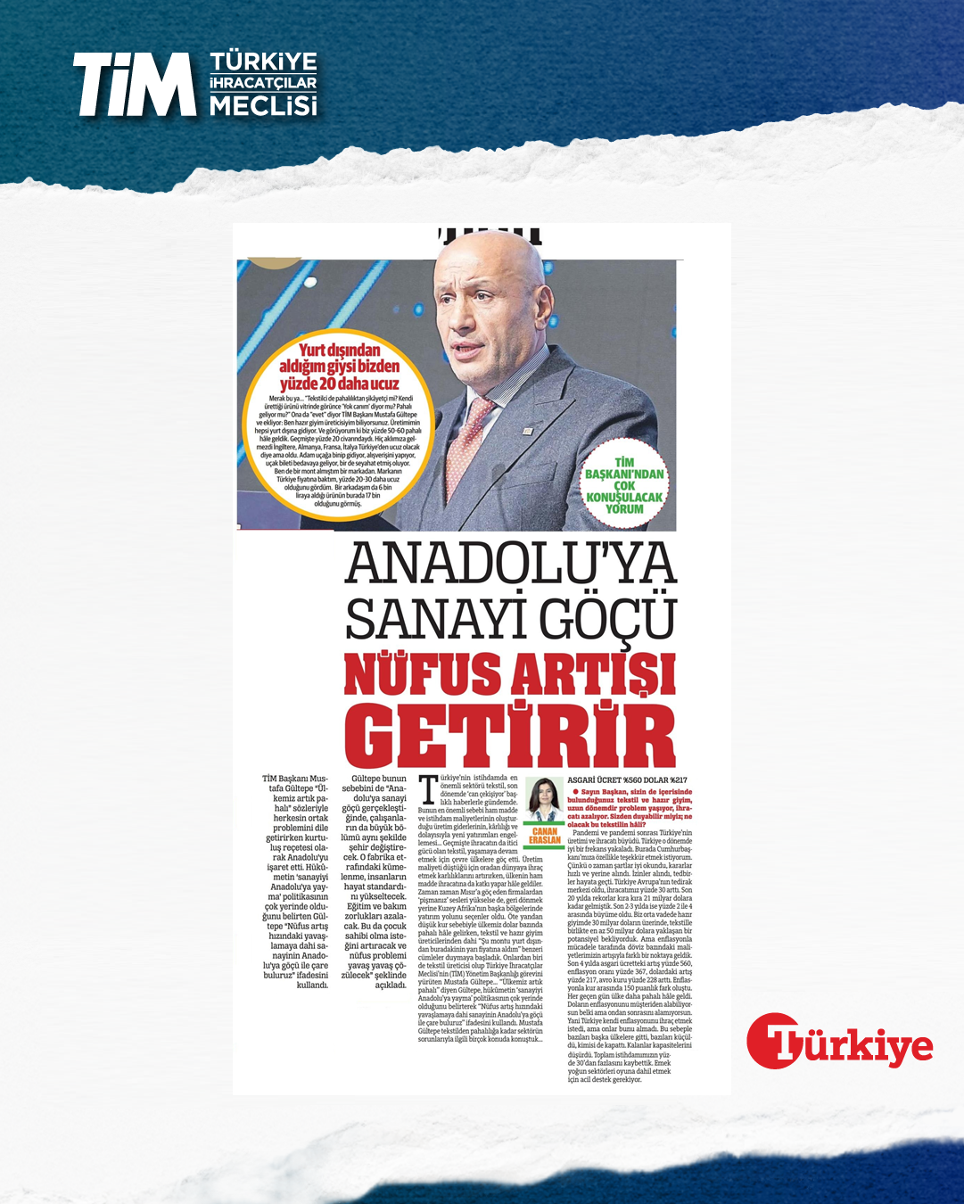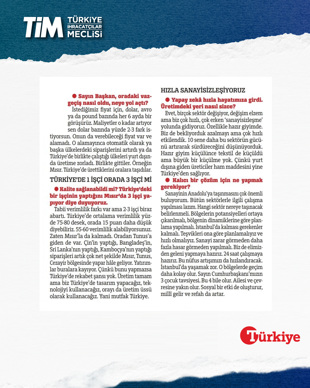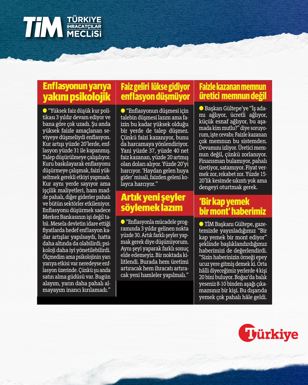 TİM Başkanı Mustafa Gültepe, Türkiye Gazetesi Ekonomi Müdürü Canan Eraslan'ın ihracat gündemindeki pek çok başlığa ilişkin sorularını yanıtladı. Gültepe, artan maliyetler ve kur politikası nedeniyle Türkiye'nin özellikle tekstil ve hazır giyim gibi emek yoğun sektörlerde rekabet gücü kaybettiğini belirtti. Gültepe, "Enflasyonla mücadele programında üç yıldır gelinen nokta yüzde 30. Üretimi ve ihracatı artıracak yeni hamleler yapılmalı.” dedi.