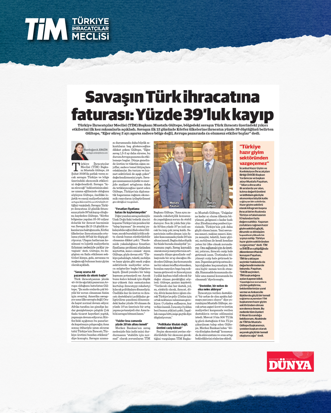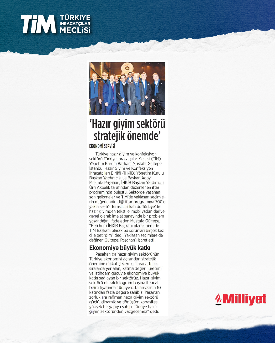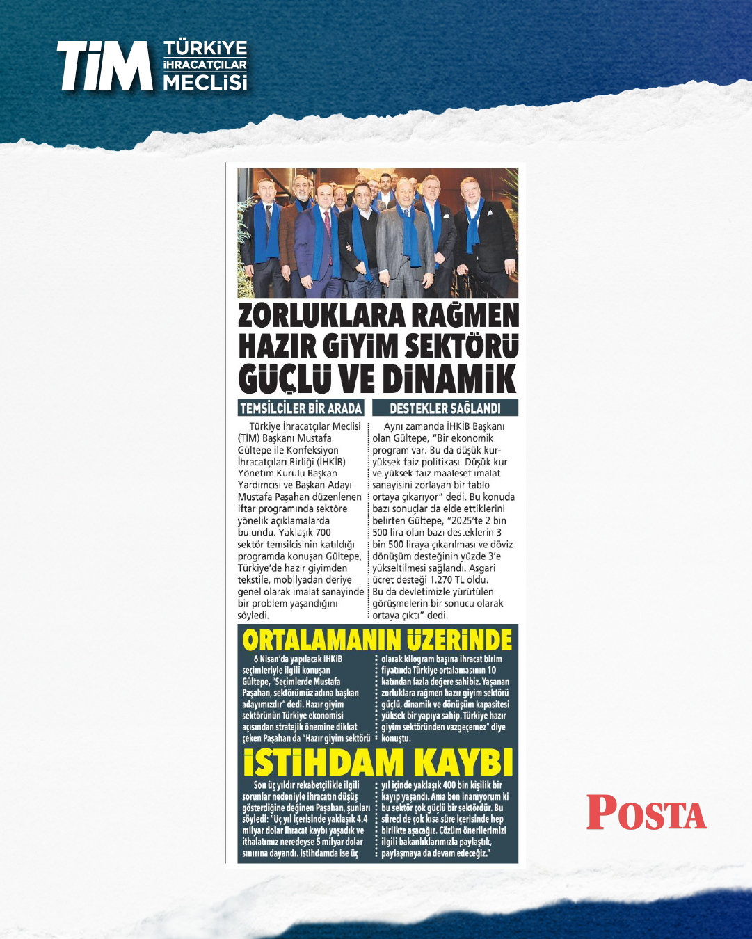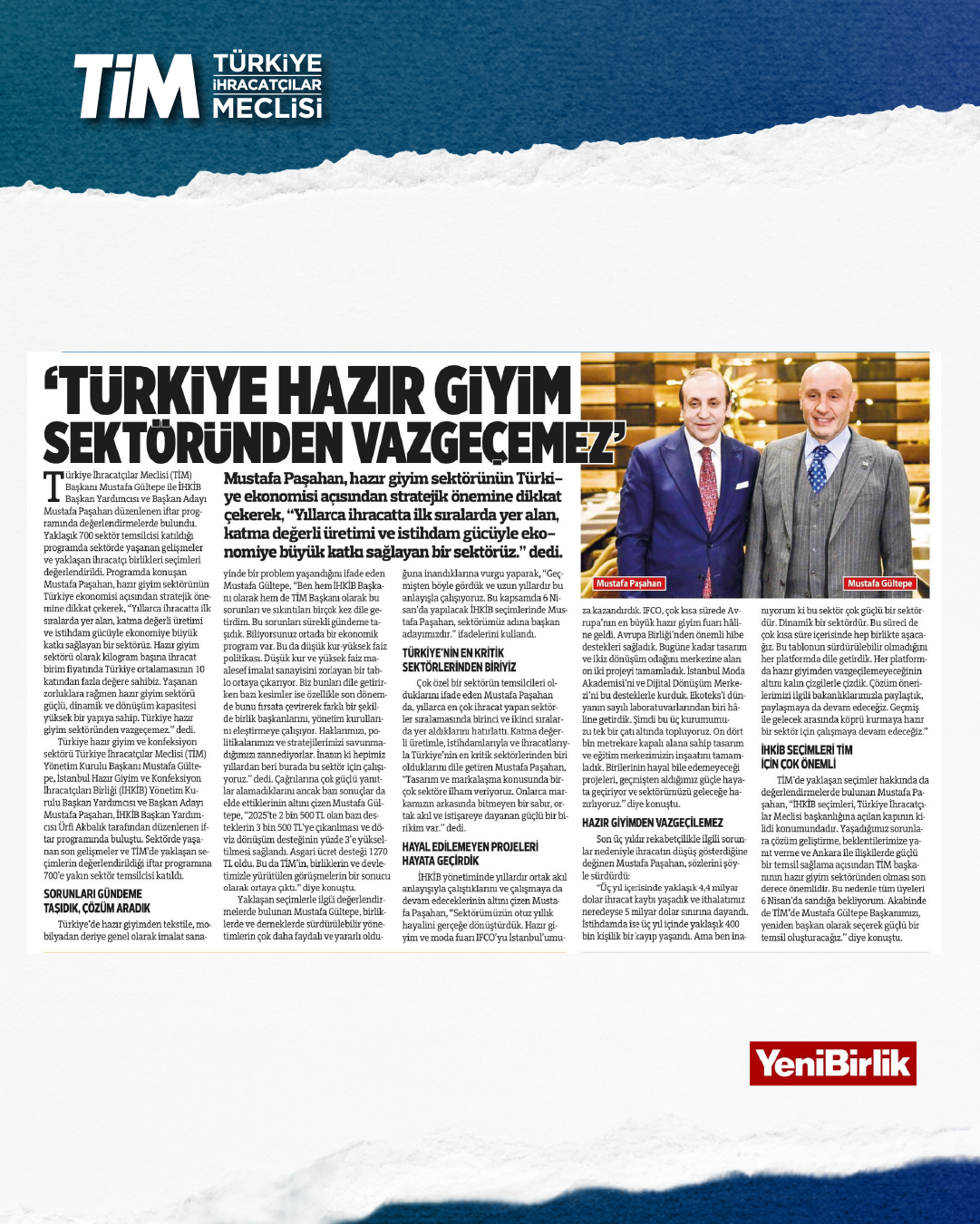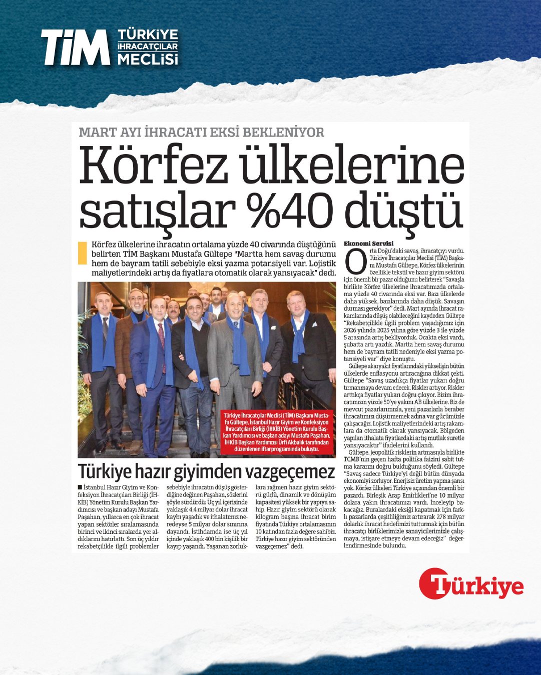 TİM Başkanı Mustafa Gültepe, İHKİB iftar programında sektöre yönelik açıklamalarda bulundu. Gültepe, Türkiye'de hazır giyimden tekstile, mobilyadan deriye genel olarak imalat sanayinde bir problem yaşandığını söyledi. Düşük kur ve yüksek faizin imalat sanayisini zorlayan bir tablo ortaya çıkardığını belirten Gültepe, “Zorluklara rağmen hazır giyim sektörü güçlü ve dönüşüm kapasitesi yüksek bir yapıya sahip. Türkiye, hazır giyim sektöründen vazgeçemez.” dedi.