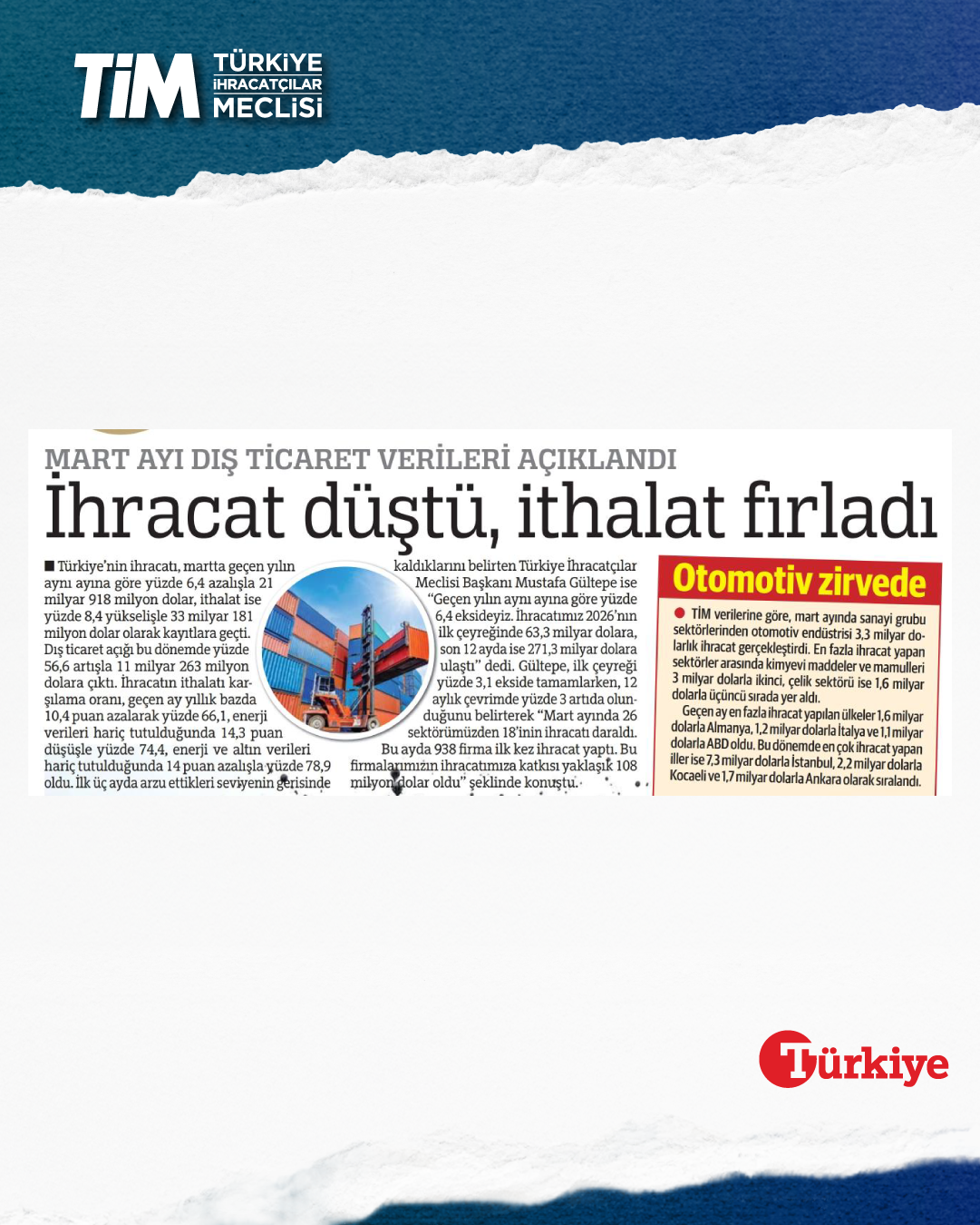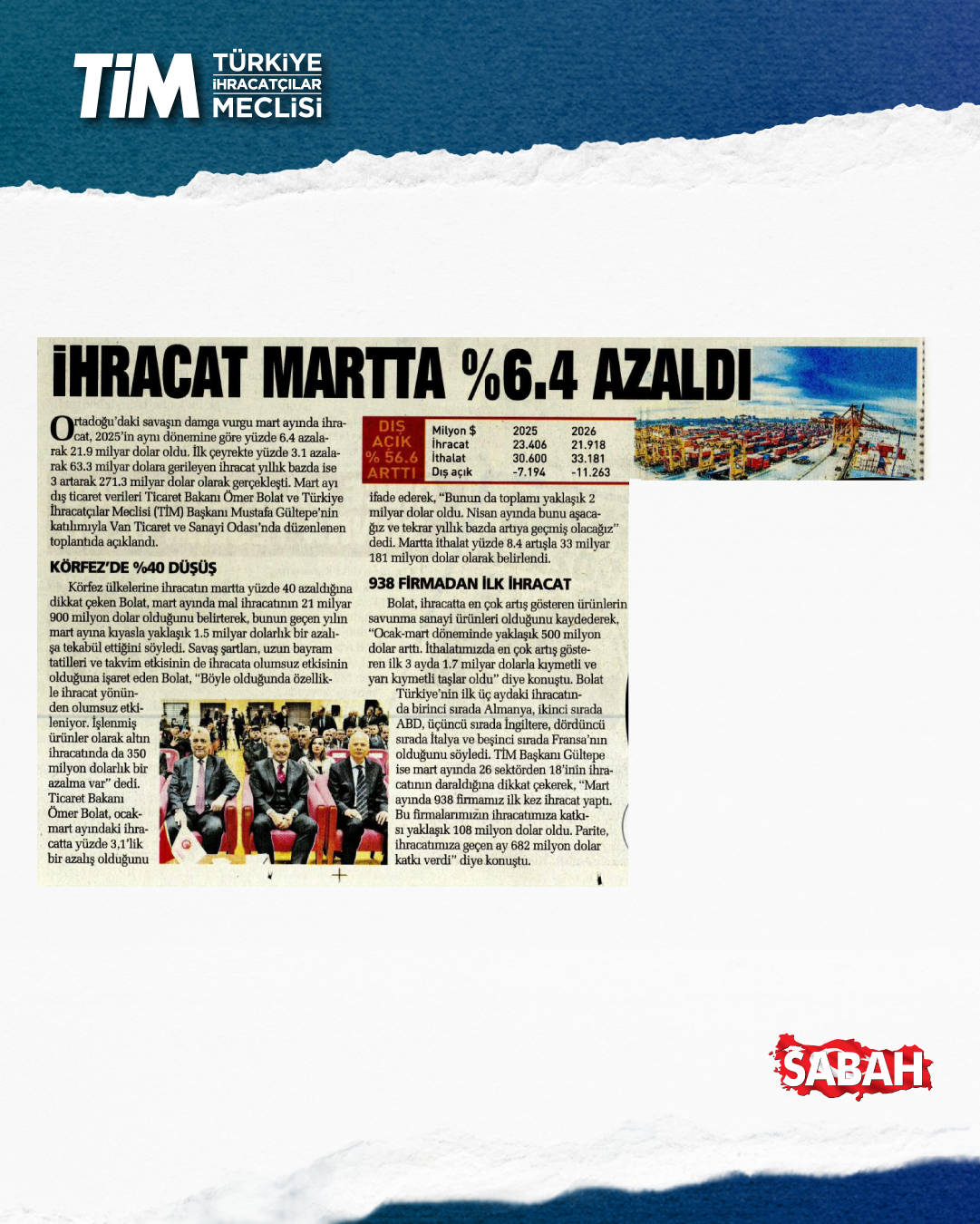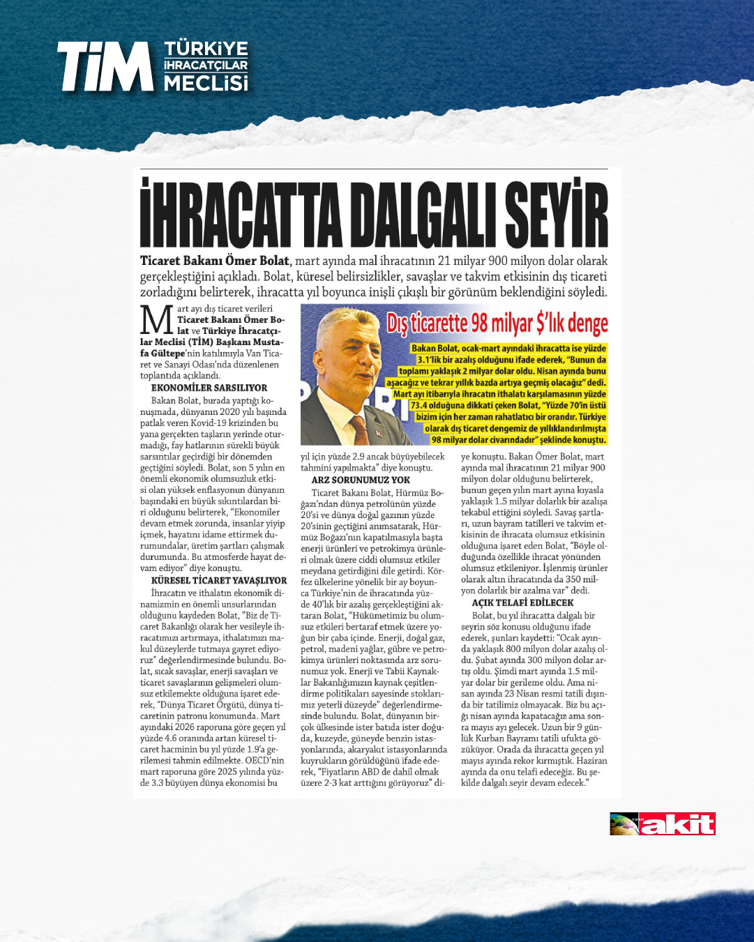 Mart ayı ihracat verileri Ticaret Bakanı Prof. Dr. Ömer Bolat ve TİM Başkanı Mustafa Gültepe tarafından Van'da açıklandı. Türkiye'nin mart ayı ihracatı 21,9 milyar dolar dolar oldu. 2026 yılında ilk çeyrek ihracatı 63,3 milyar dolara, son 12 aylık ihracat ise 271,3 milyar dolara ulaştı. TİM Başkanı Mustafa Gültepe, mart ayıyla birlikte ihracatta ilk çeyrek performansının netleştiğini söyledi. İlk üç ayda arzu ettikleri seviyenin gerisinde kaldıklarını belirten Gültepe, “Bu zor koşullarda rekabetçiliğimizi güçlendirmek çok daha önemli hale geldi. Dolayısıyla, yeni desteklerin hızla devreye alınması gerekiyor. Doğru adımlarla birlikte, kalıcı başarılara hep birlikte ulaşabiliriz.” dedi.