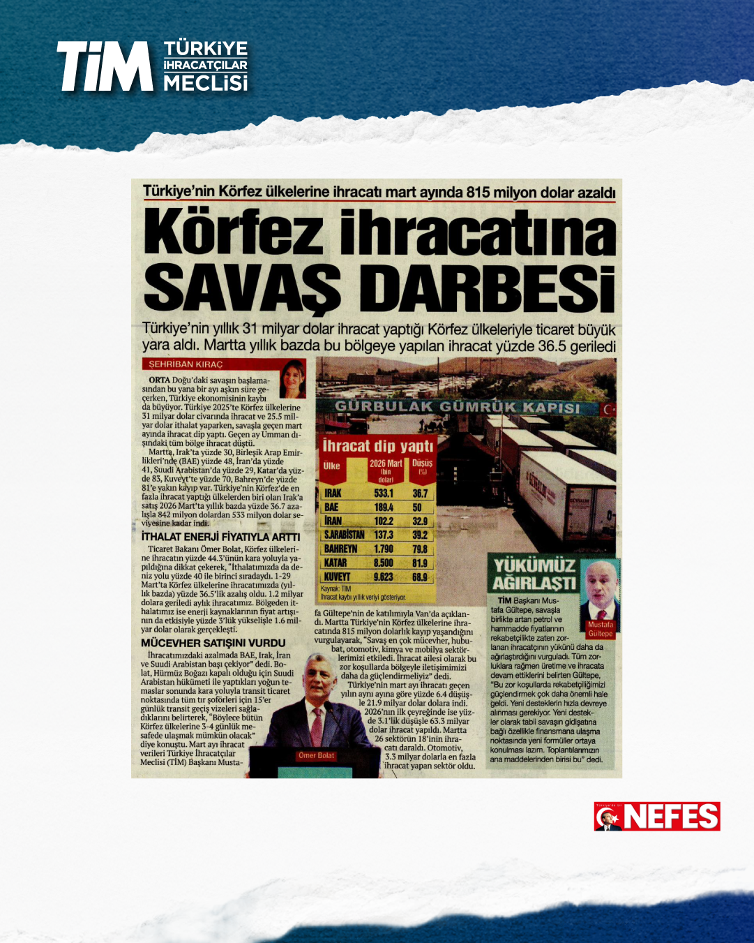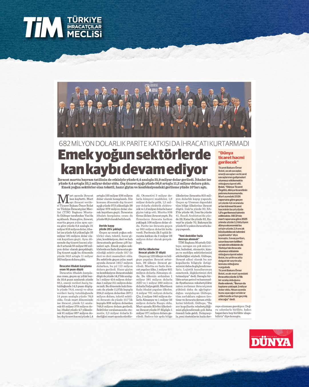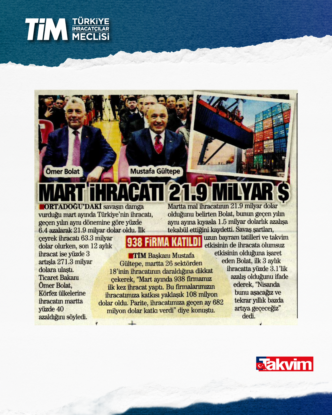 Mart ayı ihracat verileri Ticaret Bakanı Prof. Dr. Ömer Bolat ve TİM Başkanı Mustafa Gültepe tarafından Van'da açıklandı. Türkiye'nin mart ayı ihracatı 21,9 milyar dolar dolar oldu. 2026 yılında ilk çeyrek ihracatı 63,3 milyar dolara, son 12 aylık ihracat ise 271,3 milyar dolara ulaştı. TİM Başkanı Mustafa Gültepe, mart ayıyla birlikte ihracatta ilk çeyrek performansının netleştiğini söyledi. İlk üç ayda arzu ettikleri seviyenin gerisinde kaldıklarını belirten Gültepe, “Bu zor koşullarda rekabetçiliğimizi güçlendirmek çok daha önemli hale geldi. Dolayısıyla, yeni desteklerin hızla devreye alınması gerekiyor. Doğru adımlarla birlikte, kalıcı başarılara hep birlikte ulaşabiliriz.” dedi.