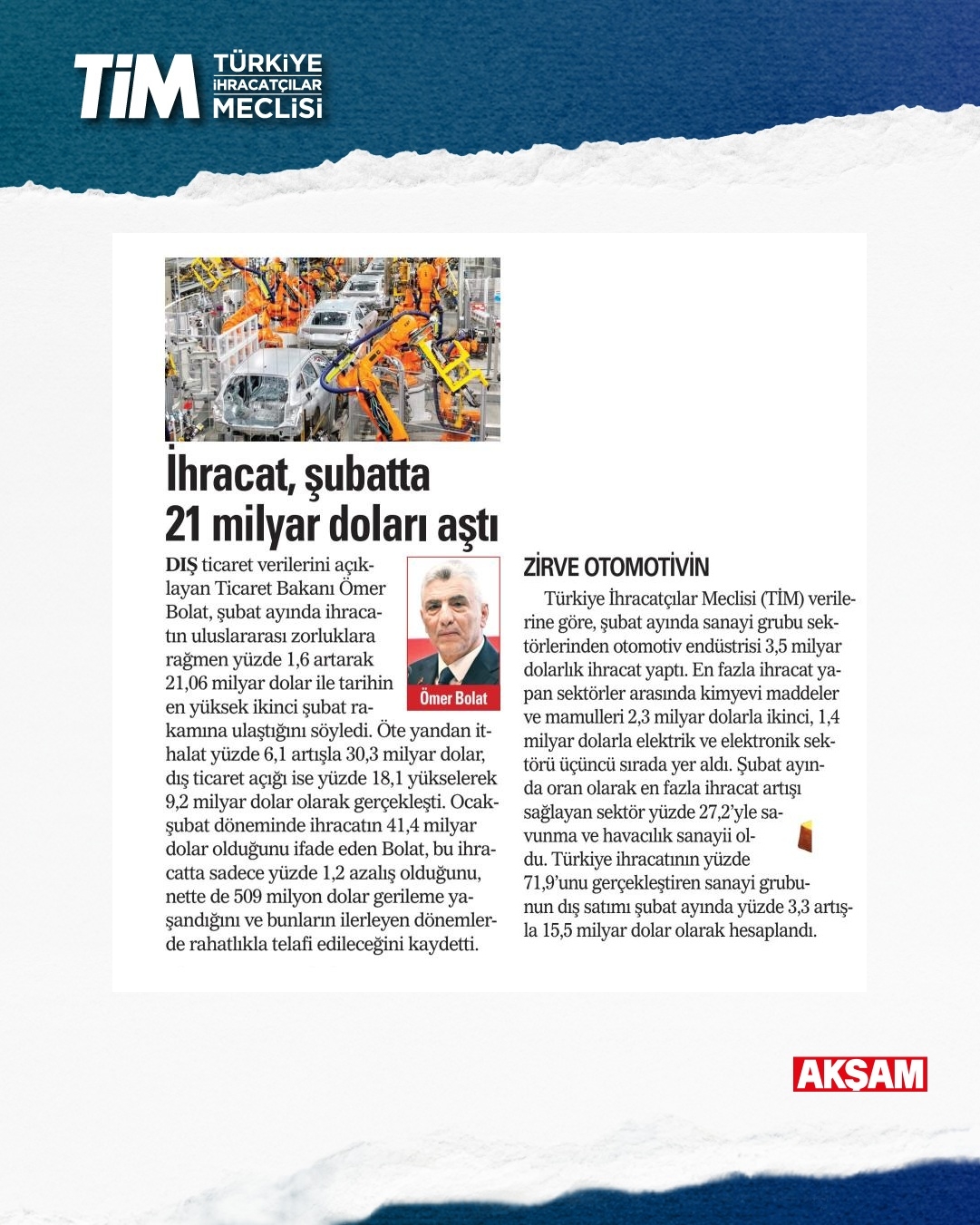 Türkiye'nin şubat ayı ihracatı yüzde 1,6 artışla 21 milyar dolar 65 milyon dolar oldu. Ocak-şubat döneminde iki aylık ihracat 41,4, son 12 aylık ihracat ise 272,8 milyar dolar düzeyinde gerçekleşti. TİM Başkanı Mustafa Gültepe, konuşmasında sağlıklı ve sürdürülebilir büyümenin üretim ve ihracatla sağlanabileceği yönündeki görüşünü yineledi. Açıklanan büyüme verilerini bu gözle değerlendirdiklerini belirten Gültepe, “2025'in hiçbir çeyreğinde net ihracat büyümeye katkı sunamadı. Oysa biz büyümenin en az yarısının üretim ve ihracattan gelmesi gerektiğini düşünüyoruz.” dedi.