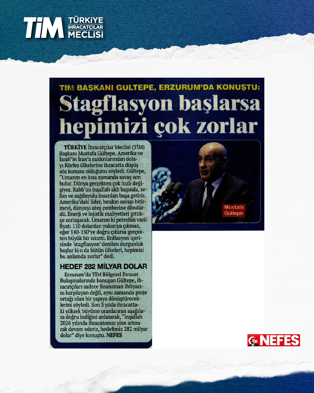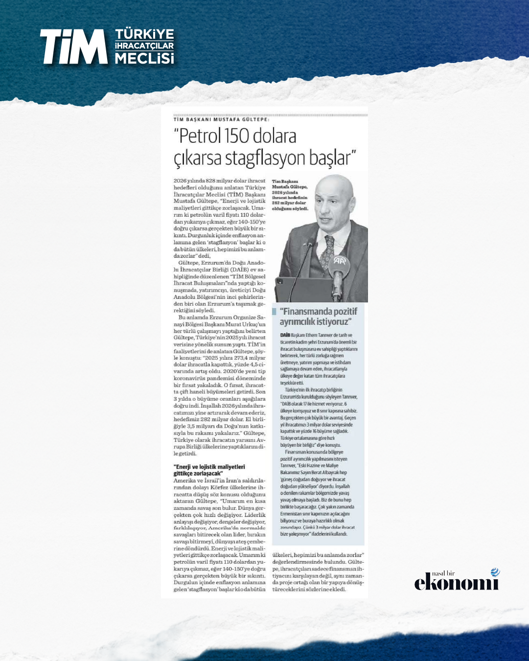 TİM Bölgesel İhracatçı Buluşmaları” programının dokuzuncusu, Doğu Anadolu İhracatçılar Birliğinin (DAİB) ev sahipliğinde Erzurum'da gerçekleştirildi. Programın açılışında konuşan TİM Başkanı Mustafa Gültepe, Ortadoğu'da yaşanan savaş ve çatışma ortamının, ticaret akışını doğrudan etkilediğini belirtti. Gültepe, “Açık konuşmak gerekirse petrol fiyatlarının 100 doların üzerine çıkması bile ciddi bir risk. 140-150 dolar seviyeleri ise küresel anlamda büyük bir sıkıntı oluşturur. Bu da enflasyonla birlikte durgunluğu, yani stagflasyonu beraberinde getirir.” dedi.