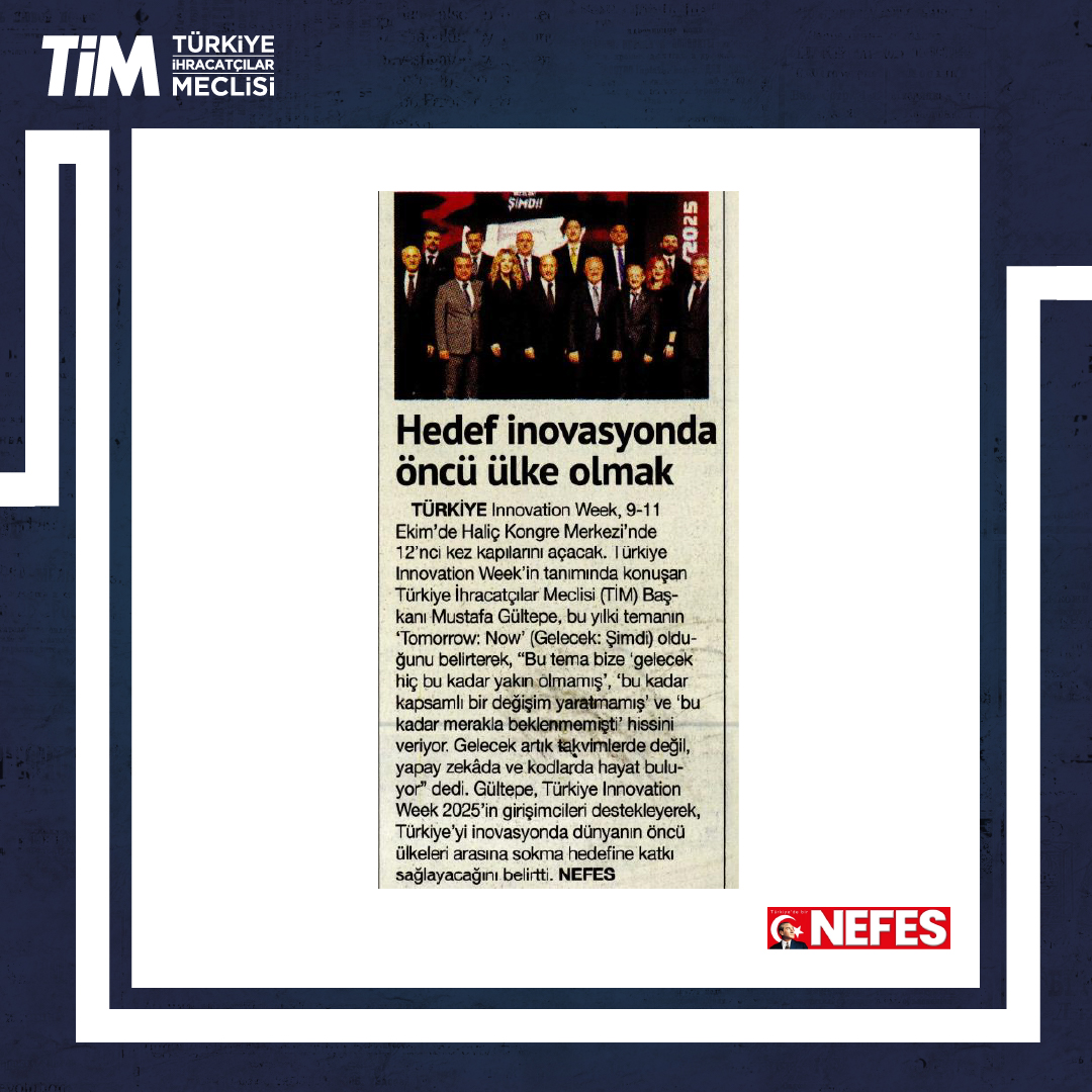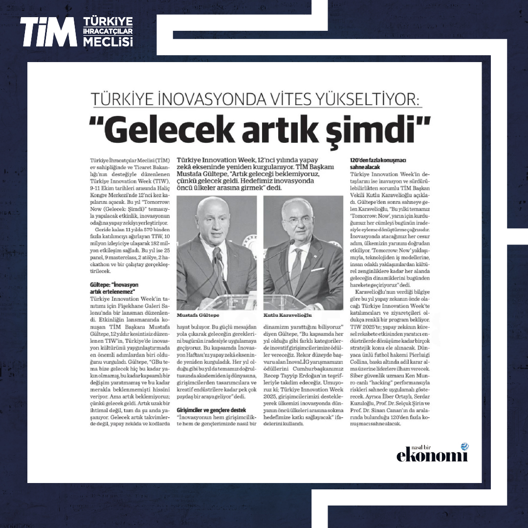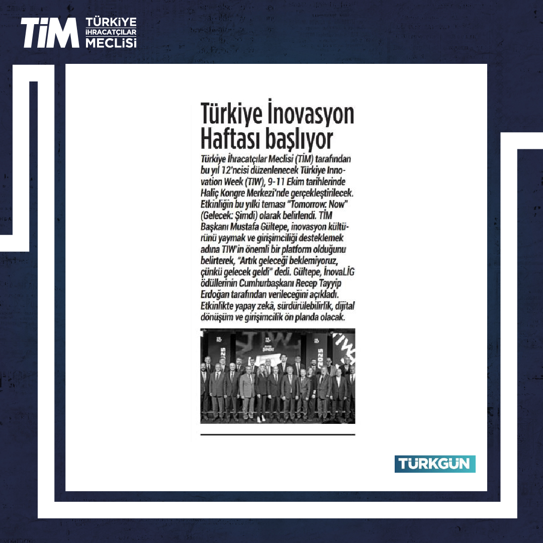 Türkiye'nin ve yakın coğrafyanın en büyük inovasyon buluşması Türkiye Innovation Week, 9-11 Ekim tarihlerinde Haliç Kongre Merkezi'nde 12'nci kez kapılarını açıyor. Tanıtım toplantısında konuşan TİM Başkanı Mustafa Gültepe, Türkiye'de inovasyon kültürünü yaygınlaştırmak, yenilikçi fikirleri teşvik etmek, katma değeri yüksek üretimle ihracatın önünü açmak için attıkları önemli adımların başında Türkiye Innovation Week'in geldiğini söyledi. Gültepe, “Bu yılki temamız 'Tomorrow: Now'. Bu güçlü mesajdan yola çıkarak geleceğin gereklerini bugünün iradesiyle uygulamaya geçiyoruz.” dedi.