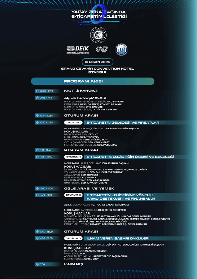 Yapay Zekâ Çağında E-Ticaretin Lojistiği Zirvesi, İstanbul Ekonomik Araştırmalar Derneği organizasyonunda; DEİK/Lojistik İş Konseyi ve DEİK/Dijital Teknolojiler İş Konseyi ile Uluslararası Nakliyeciler Derneği'nin (UND) destekleriyle, 10 Nisan 2026 tarihinde 08.30-17.00 saatleri arasında Grand Cevahir Convention Hotel'de gerçekleştirilecektir.